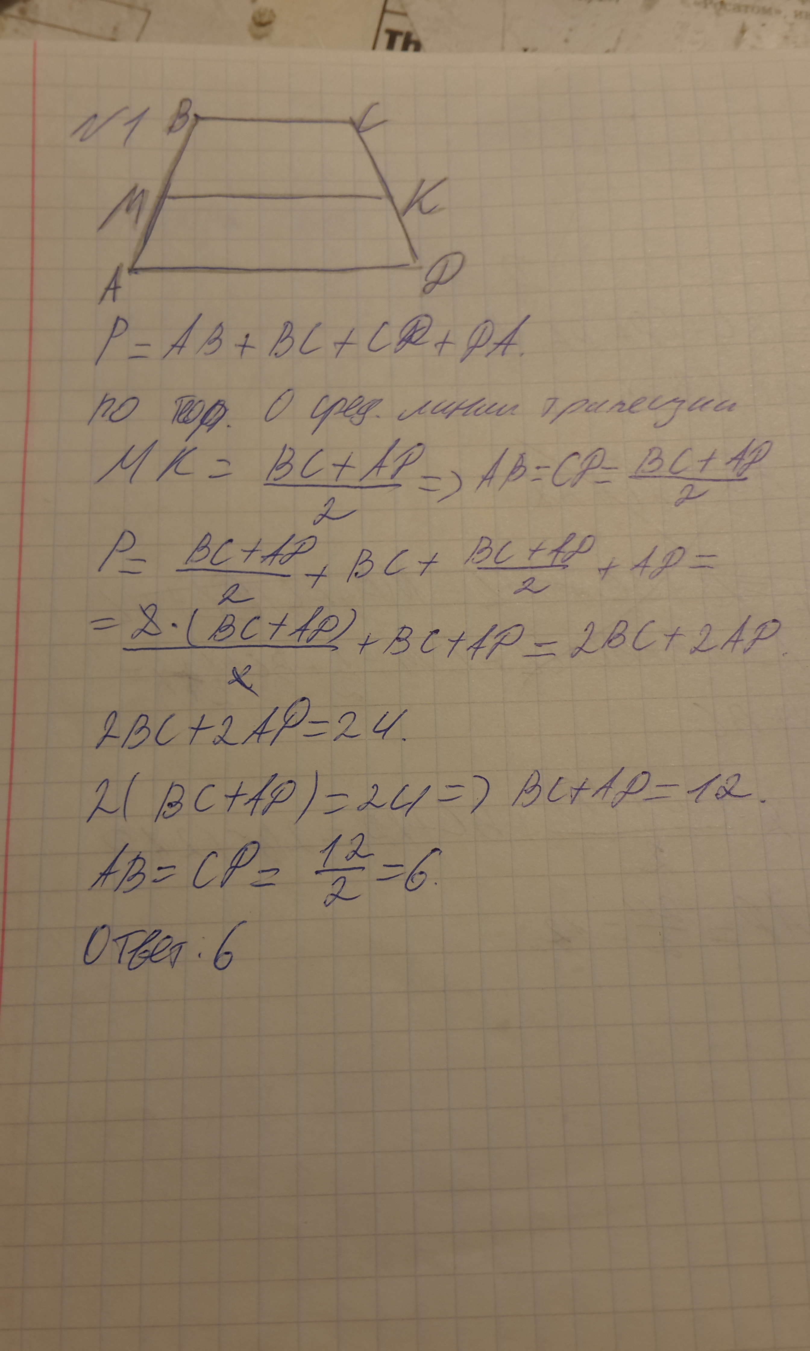1.Найдите длину боковой стороны равнобедренной трапеции, если она равна ее средней линии, а периметр трапеции равен 24 см.