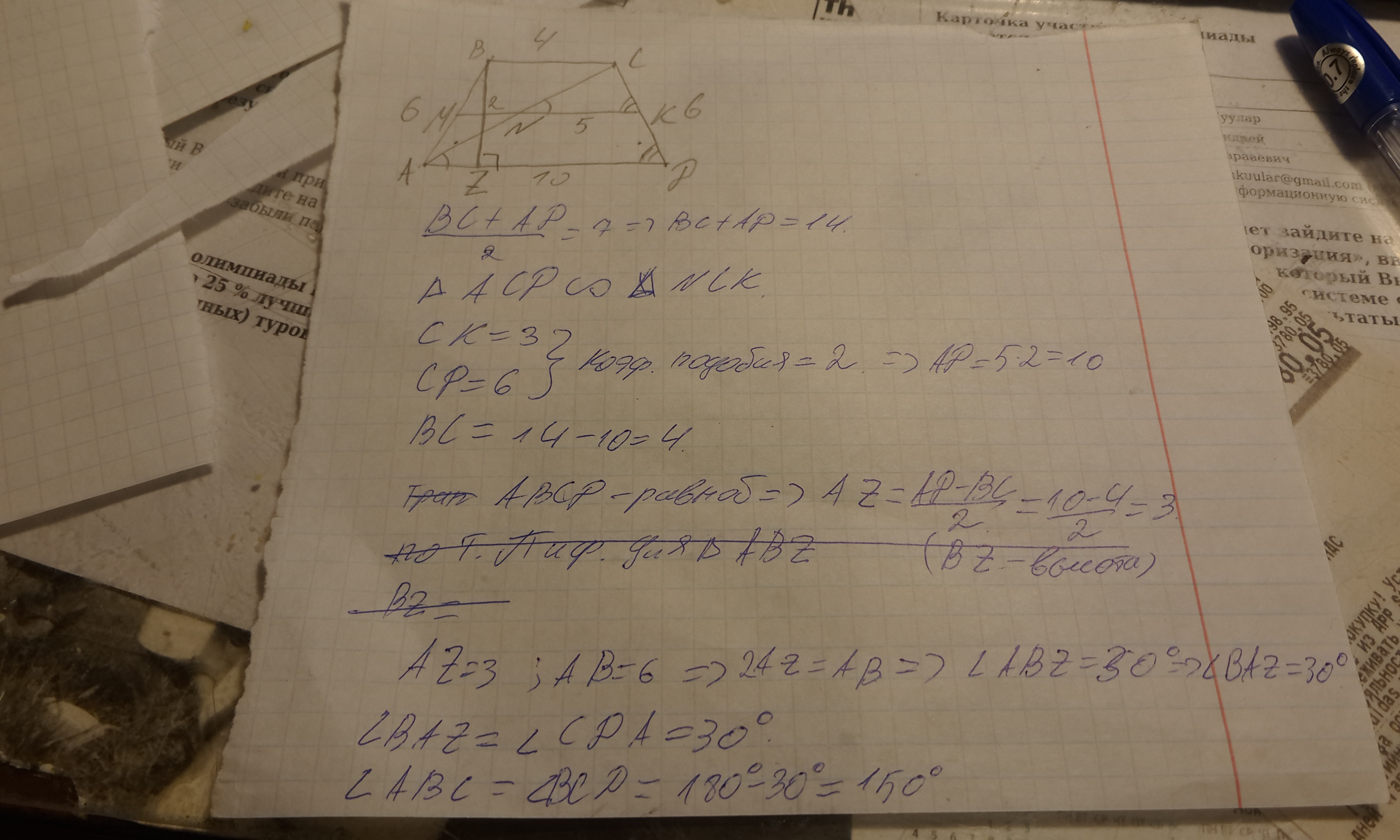 2. Средняя линия трапеции делится ее диагональю на части, равные 2 см и 5 см. Вычислите угла трапеции, если каждая из боковых сторон равна 6 см.