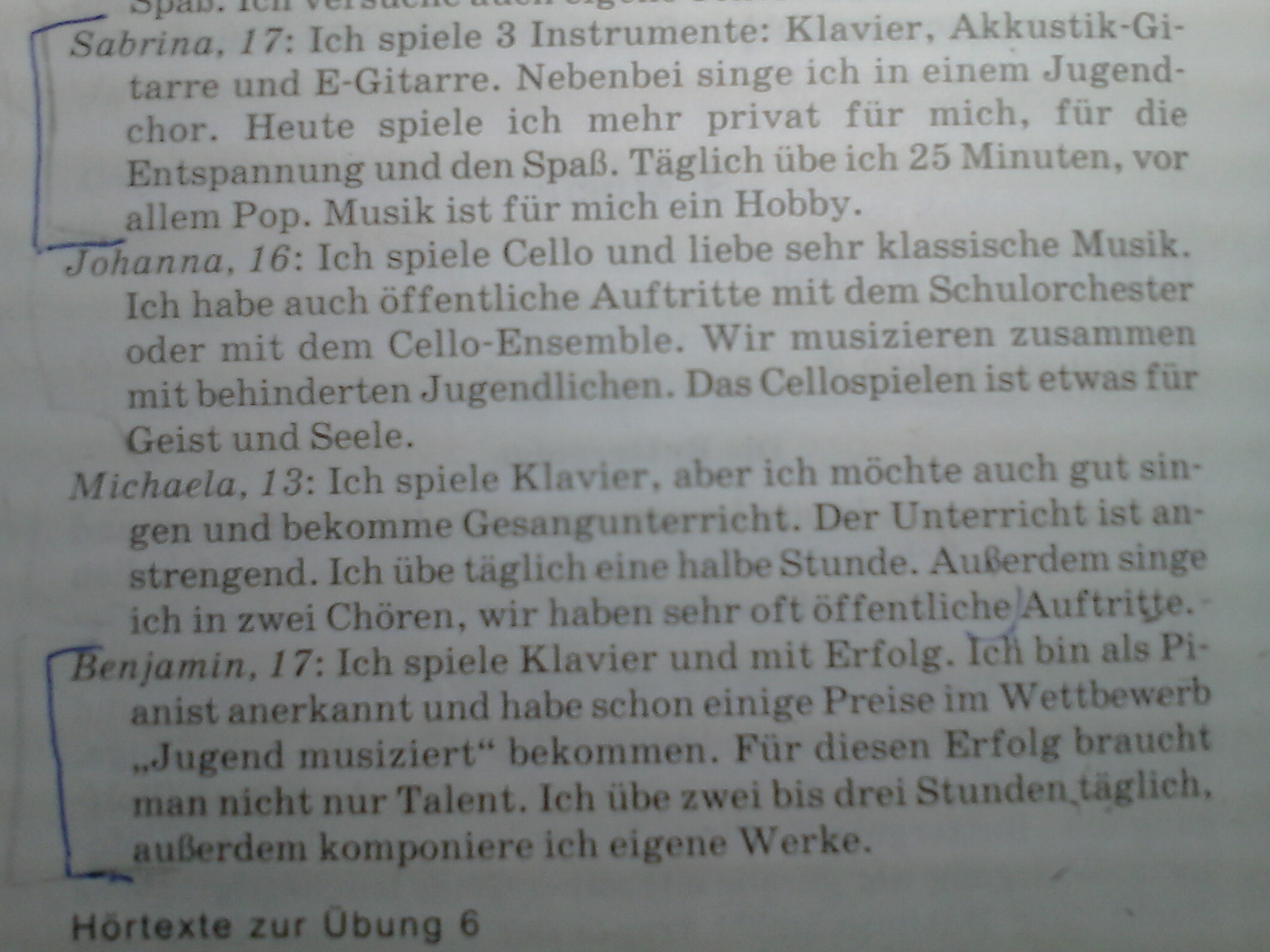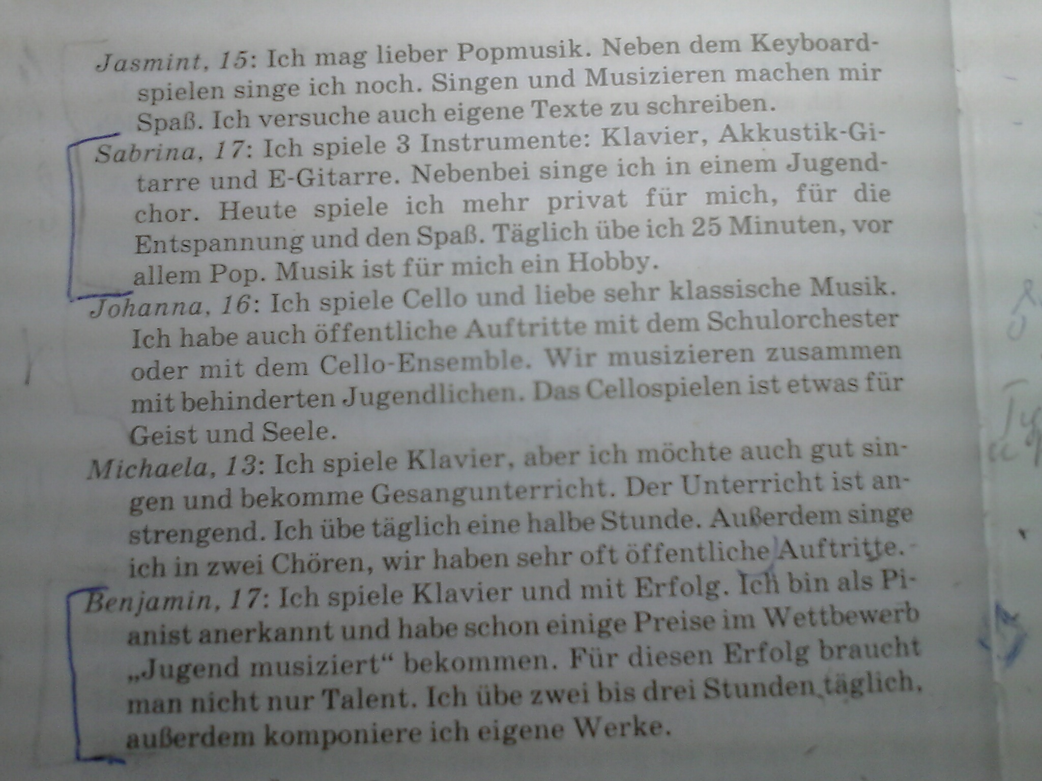 Бенджамин, 17 лет: Я с успехом играю на фортепиано. Я хочу стать признанным пианистом и получить премию на конкурсе "Детское музицирование". Для этого успеха нужен не только талант. Я занимаюсь по 2 или 3 урока ежедневно, кроме того проигрываю собственные произведения