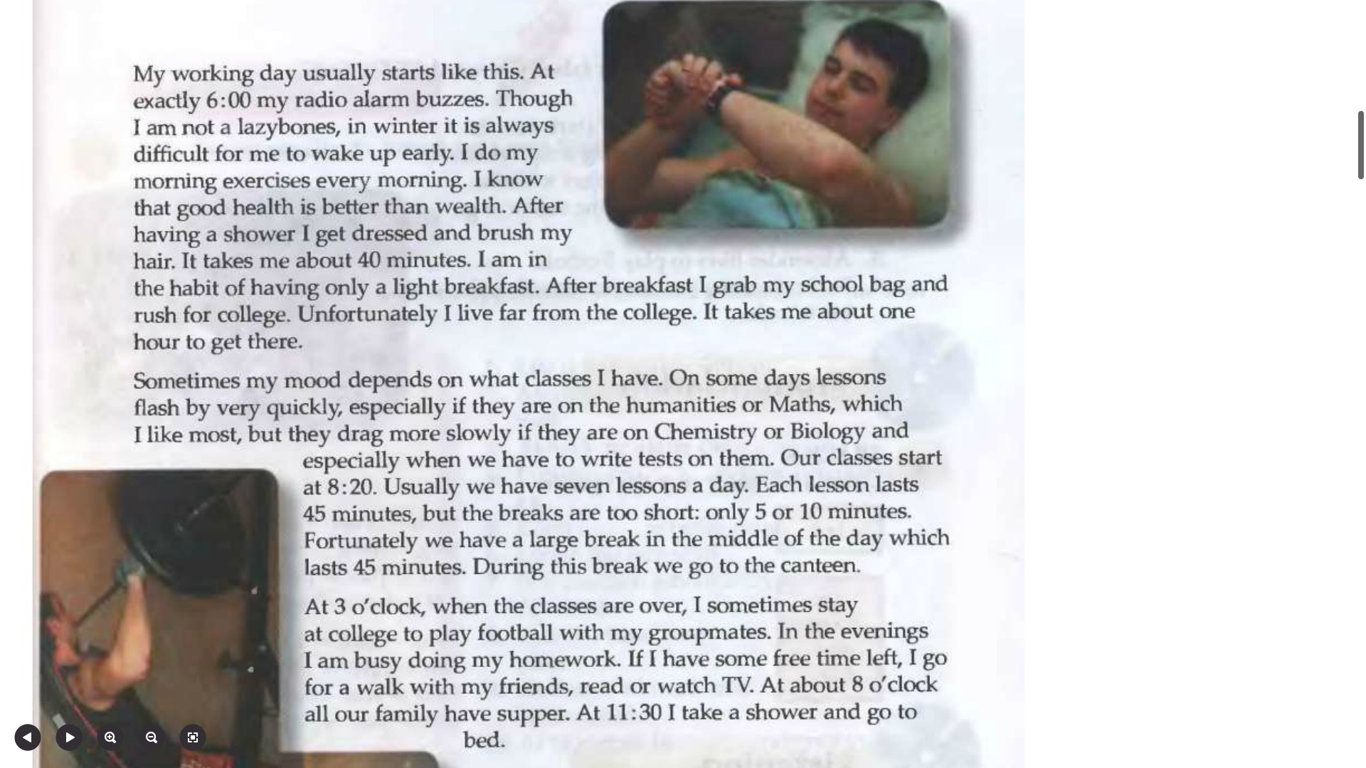 Мой рабочий день обычно начинается, как это, ровно в 6:00 моя тревога радио жужжит. Хотя я не лентяй, зимой всегда трудно для меня, чтобы просыпаться рано я делаю зарядку каждое утро, я знаю, что хорошее здоровье лучше, чем богатство. После того, как душа Одевайся и чистить мои волосы. Это занимает у меня около 40 минут. Я привык иметь только легкий завтрак. После завтрака я хватаю школьную сумку и бросаются в колледж. К сожалению, я живу далеко от колледжа. Он принимает меня о ОНК час, чтобы добраться туда. Иногда мое настроение зависит от того, какие классы у меня есть. В некоторые дни уроки мелькают очень быстро, особенно, если они находятся на гуманитарных науках или математике, которые мне нравятся больше всего, но они тянут медленнее, если они по химии или биологии и особенно, когда мы должны писать тесты на них. Наши занятия начинаются в 8:20. Обычно у нас есть семь уроков в день. Каждый урок длится 45 минут, но перерывы слишком короткие: только 5 или 10 минут. К счастью, у нас есть большой перерыв в середине дня, который длится 45 минут. Во время этого перерыва мы идем к canteer. На 3о часы, когда закончатся школьные занятия, я иногда остаться в колледже, чтобы играть foolball с моими однокурсниками. По вечерам я занят делаю свою домашнюю работу. Если у меня есть немного свободного времени осталось, 1 пойти на прогулку с друзьями, читать или смотреть телевизор. Около 8 часов вся наша семья ужинать. В 11:30 я принять душ и лечь спать.