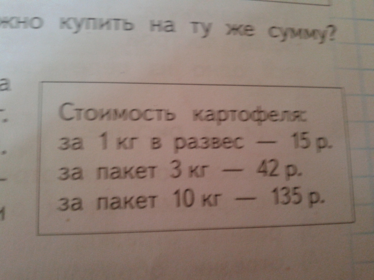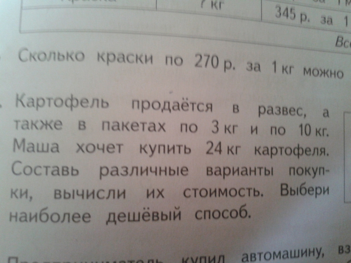 Картофель продаётся в развес, а также в пакетах по 3 кг и по 10 кг. Маша хочет купить 24 кг картофеля. Составь различные вариантв покупки, вычисли их стоимость. Выбери наиболее дешёвый способ.