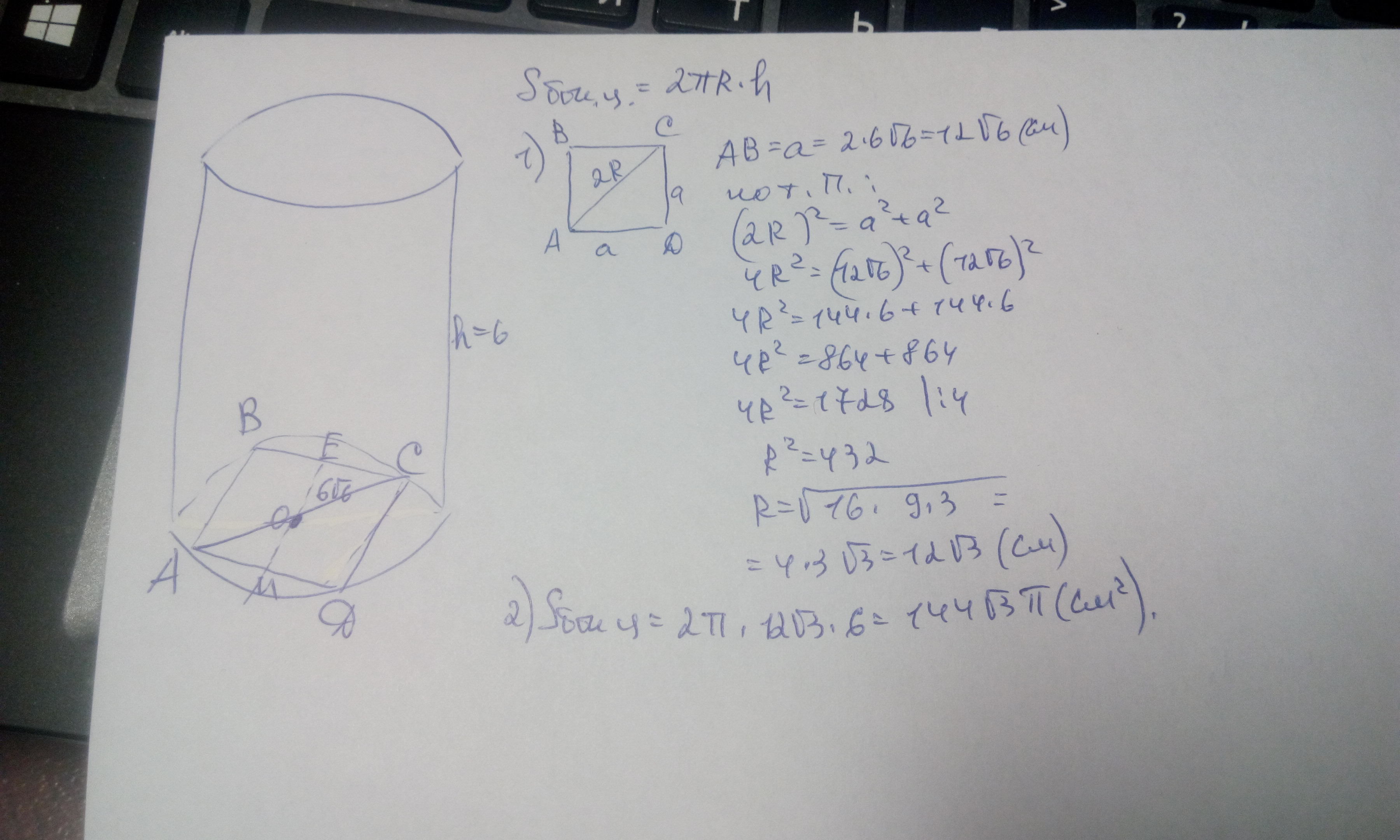 квадрат ABCD размещен в цилиндре так что его стороны AB и BC являются хордами оснований цилиндра. Найдите площадь боковой поверхности цилиндра, если его высота равна 6, а ось удалена от хорд AD и BC на 6 корне из 6 см. ( с рисунком, если можно)