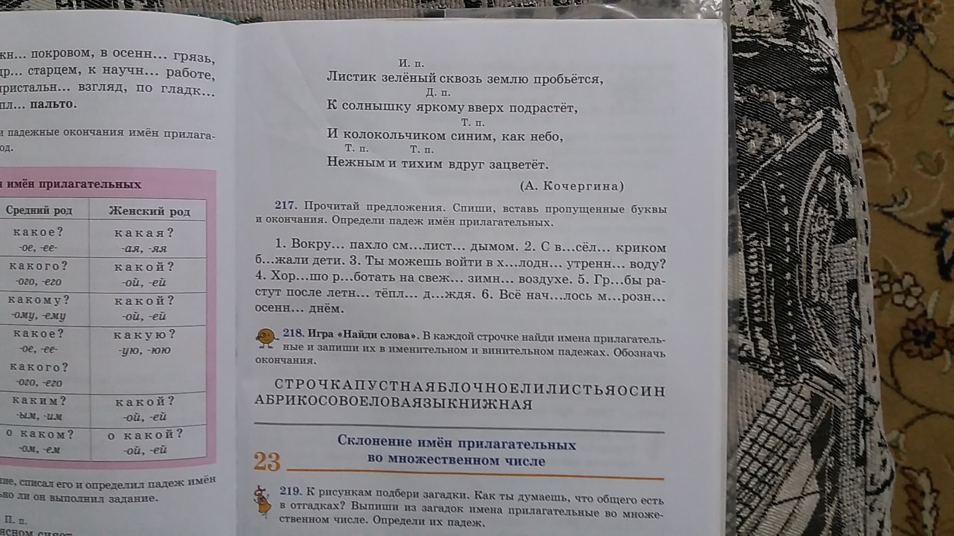 1. Вокруг пахло смолистым дымом. 2. С весёлом криком бежали дети. 3. Ты можешь войти в холодную, утреннюю воду? 4. Хорошо работать снежном зимнем воздухе. 5. Грибы растут после летнего теплого дождя. 6. Все началось морозным осеннем днём