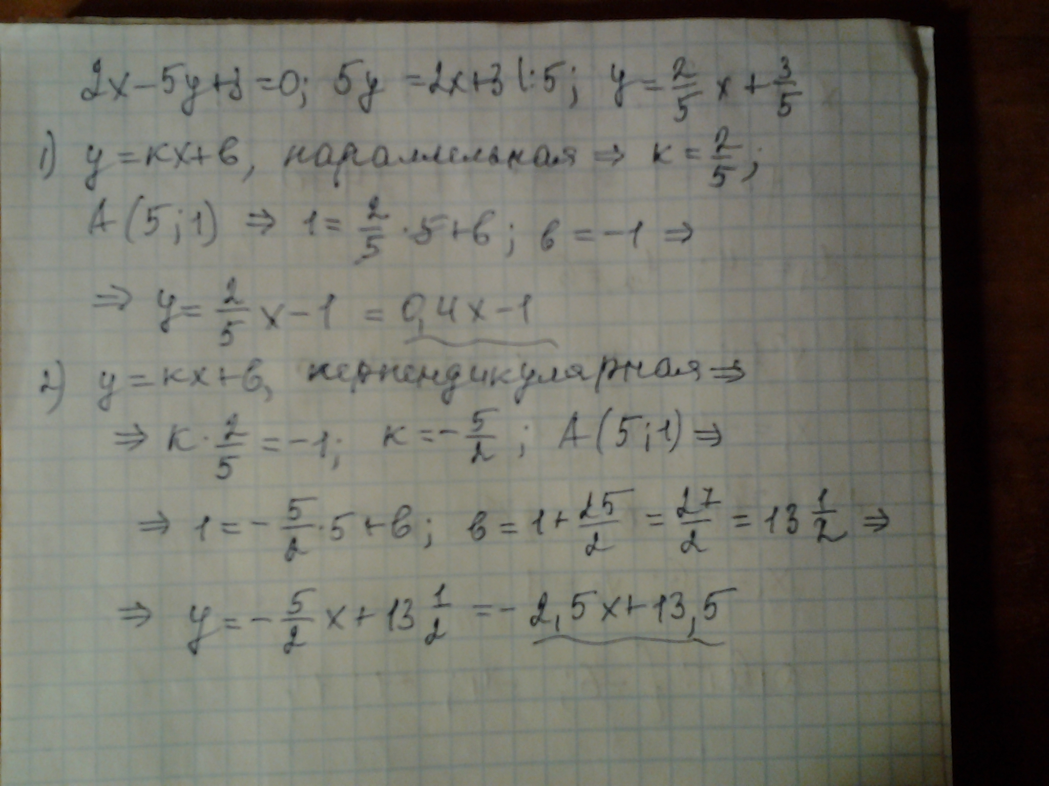 составить уравнение двух прямых проходящих через точку А(5;1),параллельно и перпендикулярно прямой 2х-5у+3=0