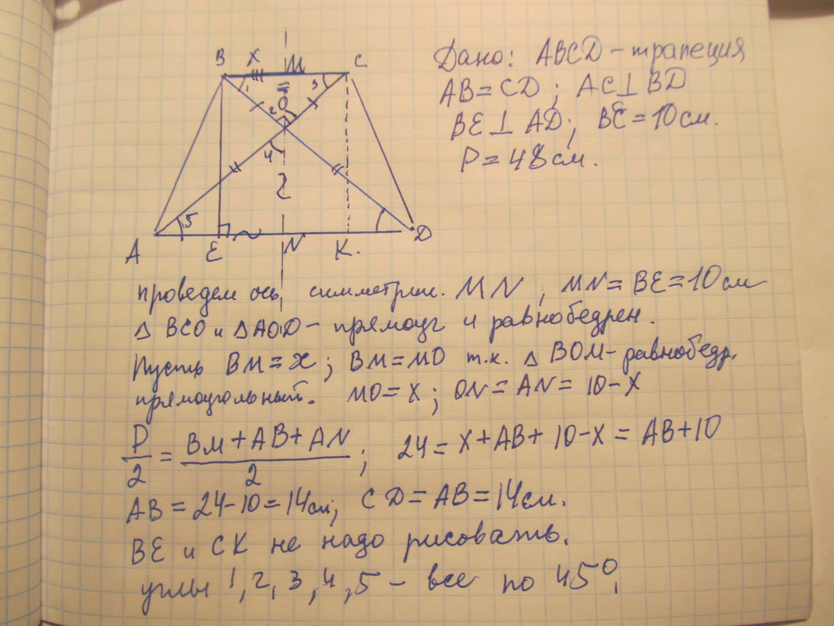 Висота рівнобічної трапеції дорівнюе 10 см, а її діагоналі перепендикулярні знайдіть бічну сторону трапецїї якщо її периметр дорівнюе 48 см.