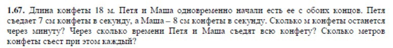 Значит им останется съесть ровно столько же, значит время на съедение целой конфеты в сумме займет 2 минуты. При этом Петя съест 8,4метра, а Маша 9,6метров