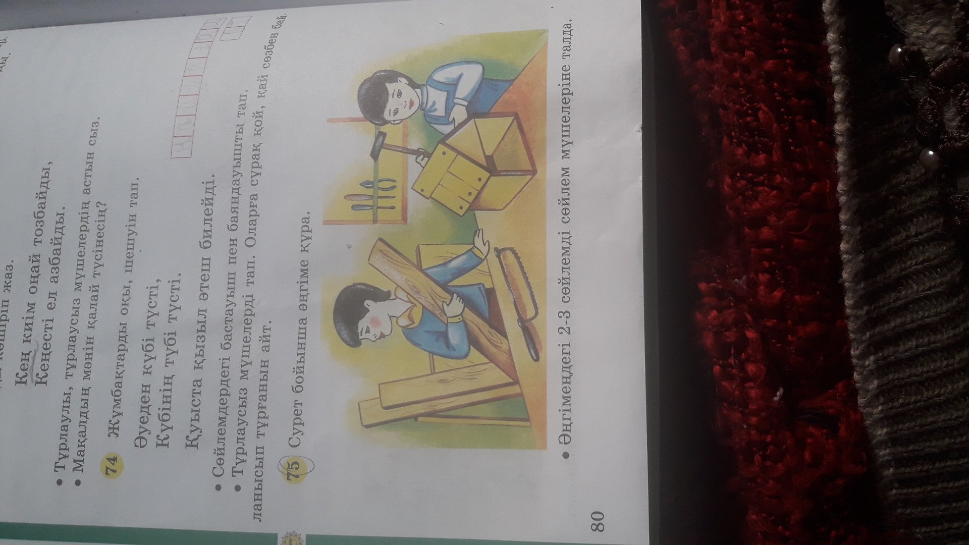 Менің əкемнің шеберханасы бар. Онда көп ұсталар жұмыс істейді. Мен кей кезде сабақ біткенде шеберханаға барып көп нәрсе үйренемін. Мен ағаштан үйшік жасағанды жақсы көрем. Бүгін де досым екеуіміз шеберханага барып құстарға үйшік жасап жатырмыз.Сосын оны ағашқа іліп жем шаштық. Осыны көрген əкем кұлімсеп мені құшақтап алды.