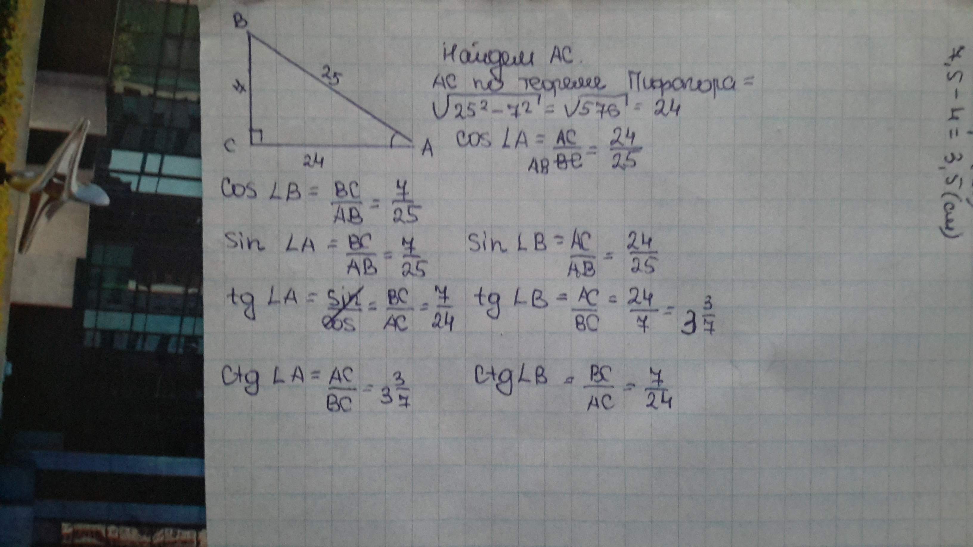 В прямоугольном треугольнике АВС (уголС=90градусов) найти синус, косинус, тангенс, котангенс углов А и В, если: АВ=25, ВС=7.