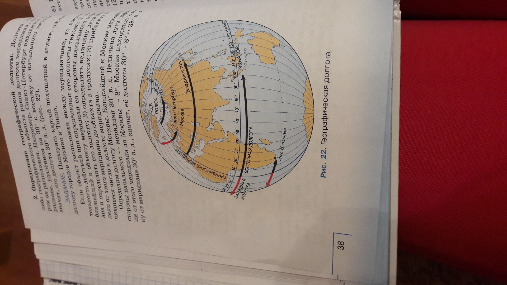 Чтобы определить долготу на карте ты должна найти середину-экватор. Все точно так же делаешь, то есть от точки города ты проводишь к СЕРЕДИНЕ и там тоже есть цифры и узнаешь сколько градусов долгота.