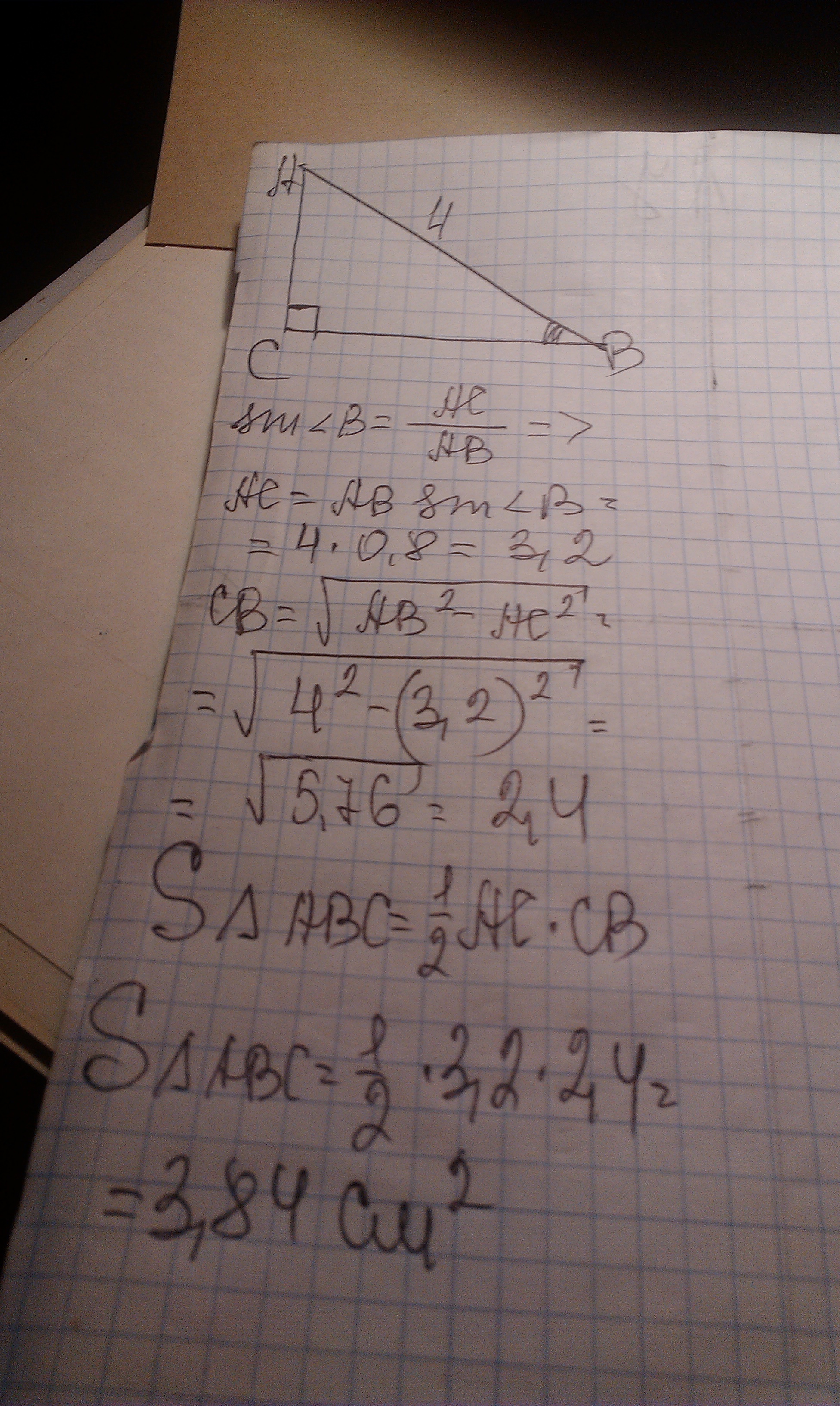 В треугольнике АВС угол С равен 90 градусов, sin B = 0,8, АВ = 4. Найдите S abc.Помогите с рисунком пожалуйста и решить