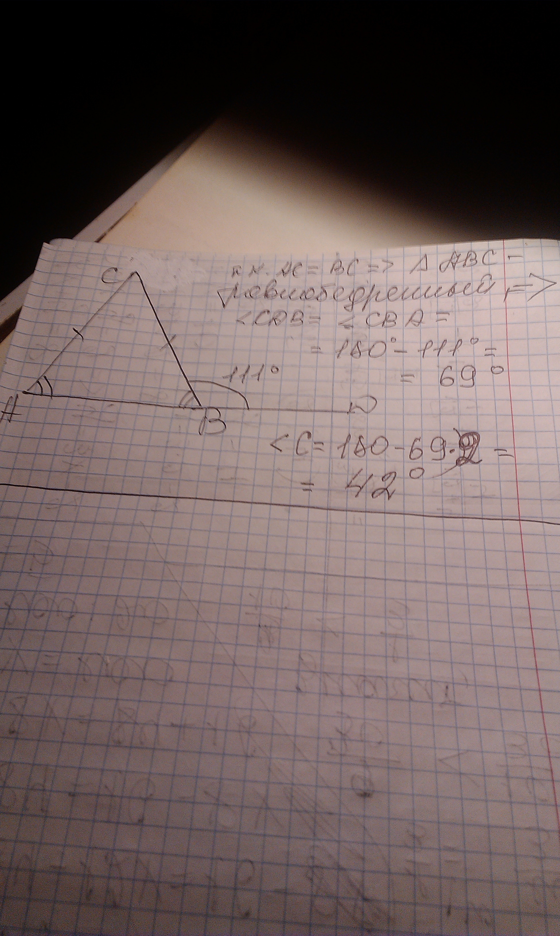 треуг АВС равнобедренный, значит углы при основании равны, то есть А=В, угол В =180-111=69, тогда и угол А=69. Сумма углов треугольника равна 180 гр. Значит угол С=180-69-69=42