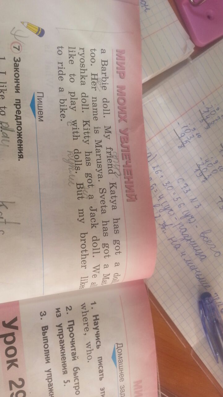 Кукла Барби. У моей подруги Кати тоже есть кукла. Её имя Маруся. У Светы есть кукла Матрёшка. А у Китти есть кукла Джек. Мы все любим играть с куклами. Но мой брат любит кататься на велосипед.