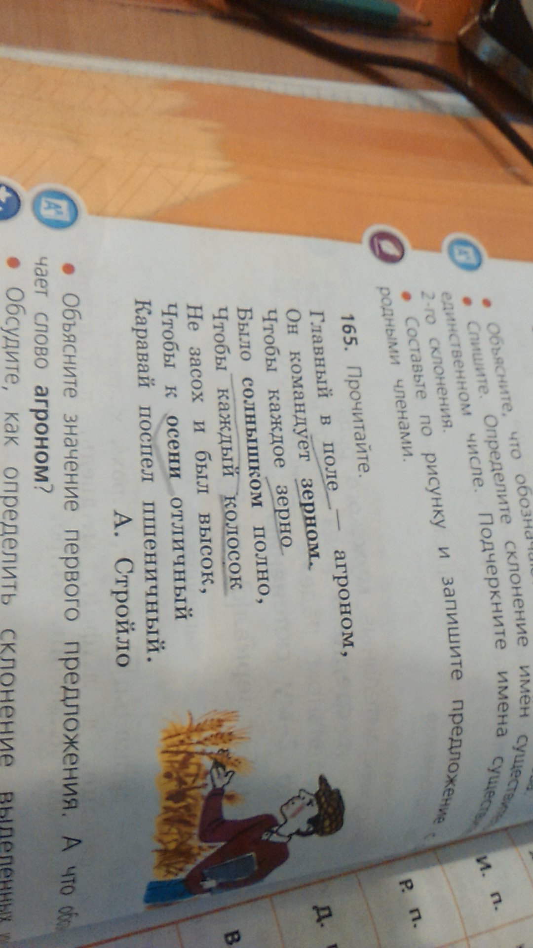 агроном, зерном, зерно, солнышком,колосок, каравай . Все эти существ. 2 скл.