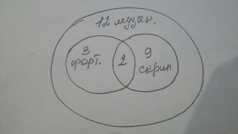 из 12 музыкантов 5 играют на фортепиано а 9 на скрипке. Сколько музыкантов играют на двух инструментах, если каждый из них играет либо на фортепиано, либо на скрипке? С РЕШЕНИЕМ