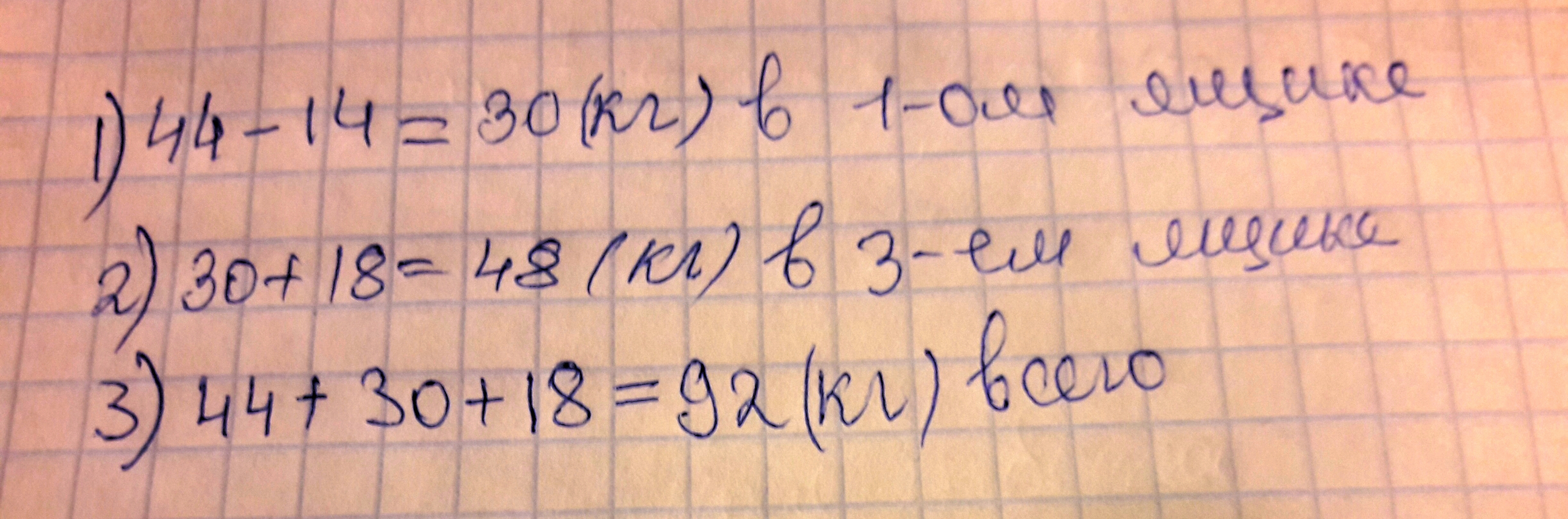 В первом ящике на 14 кг апельсинов меньше чем в во втором и на 18 кг больше чем в третьем. Сколько килограмм апельсинов во всех трёх ящиках вмести если во втором ящике их 44 кг.