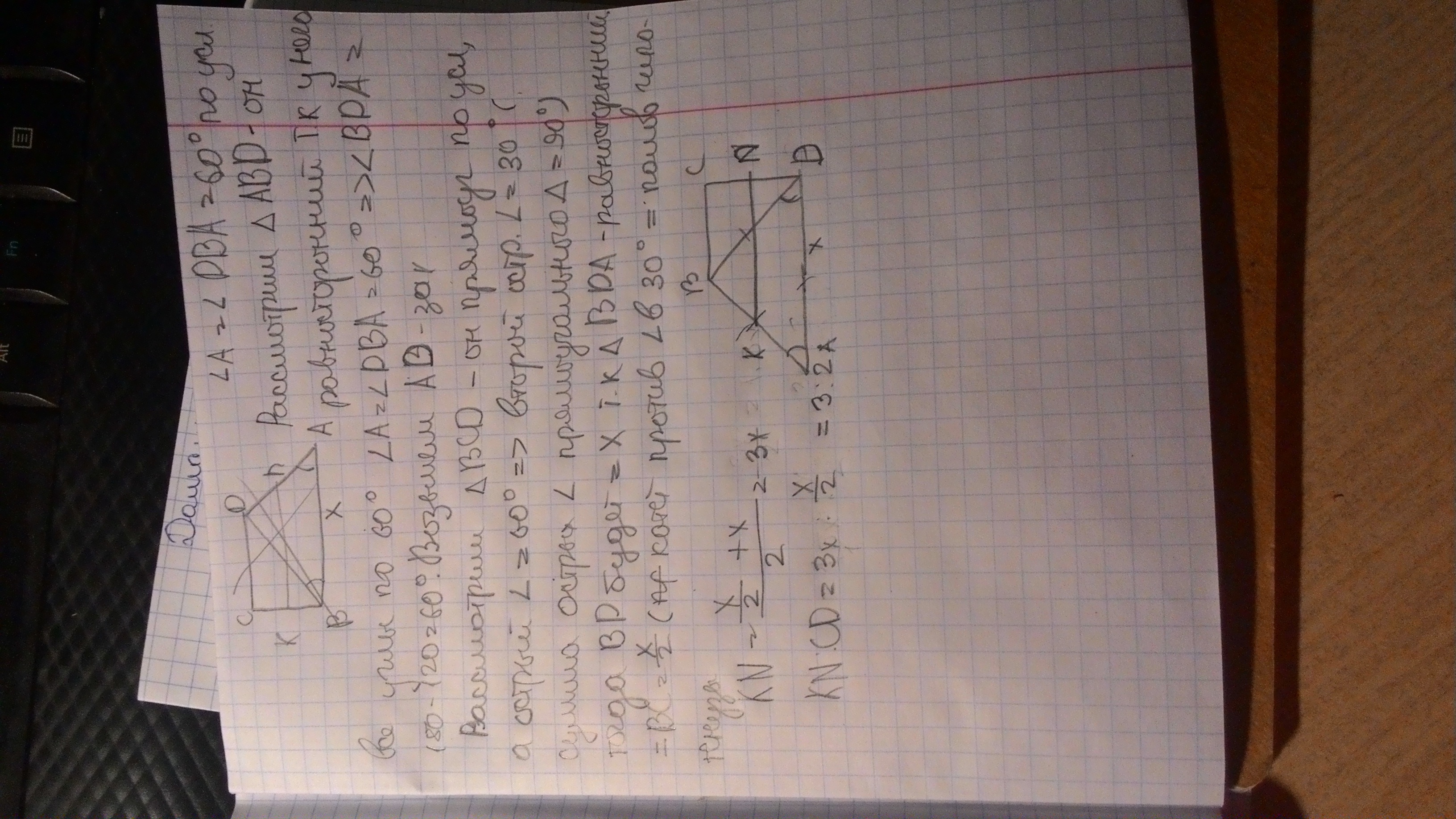 В прямоугольной трапеции острый угол и угол, который составляет меньшая диагональ с меньшим основанием,равны.Острый угол трапеции равен 60 градусов.Вычислите отношение длины средней линии трапеции к длине её меньшего основания.