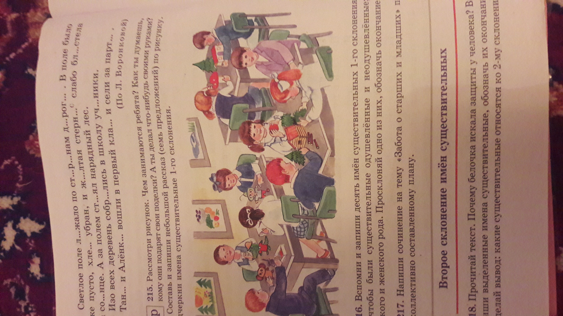 Рассмотри рисунок Чем занимается ребята Как ты думаешь компании подарить своей подделка а ты делал что-нибудь своими руками Составь и запиши небольшой рассказ 7 предложений по рисунку подчеркни имена существительные 1 склонения