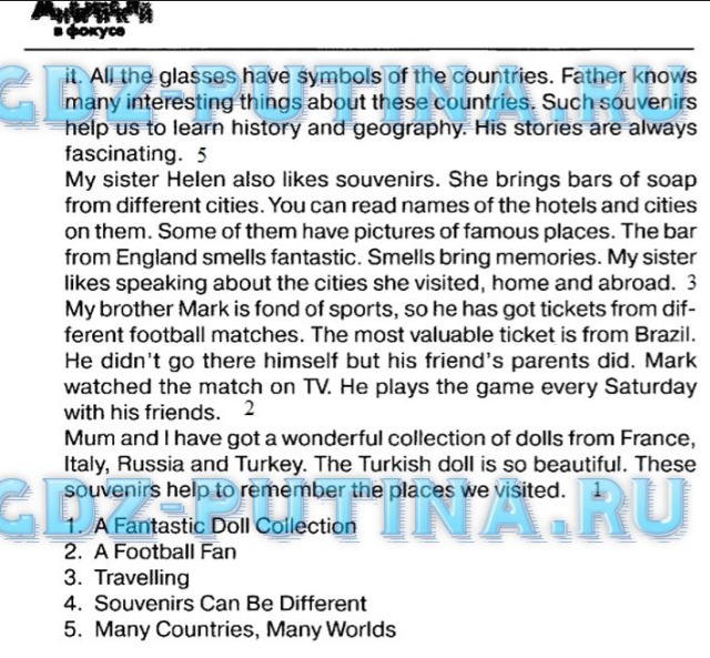 Моя сестра Хэлен тоже любит путешествовать. Она привозит мыло с разных городов. На них можно прочесть названия отелей и городов. На некоторых из них имеются изображения известных мест. Мыло из Англии пахнет фантастически. Запахи передают воспоминания.Моя сестра любит поговорить о городах, в которых она побывала, дома и за рубежом. 3 Мой брат Марк увлекается спортом, поэтому у него есть билеты с различных футбольных матчей.Самый ценный билет из Бразилии. Он сам не был там, но были родители его друга. Марк смотрит матчи по телевизору. Каждую субботу он играет в футбол со своими друзьями.