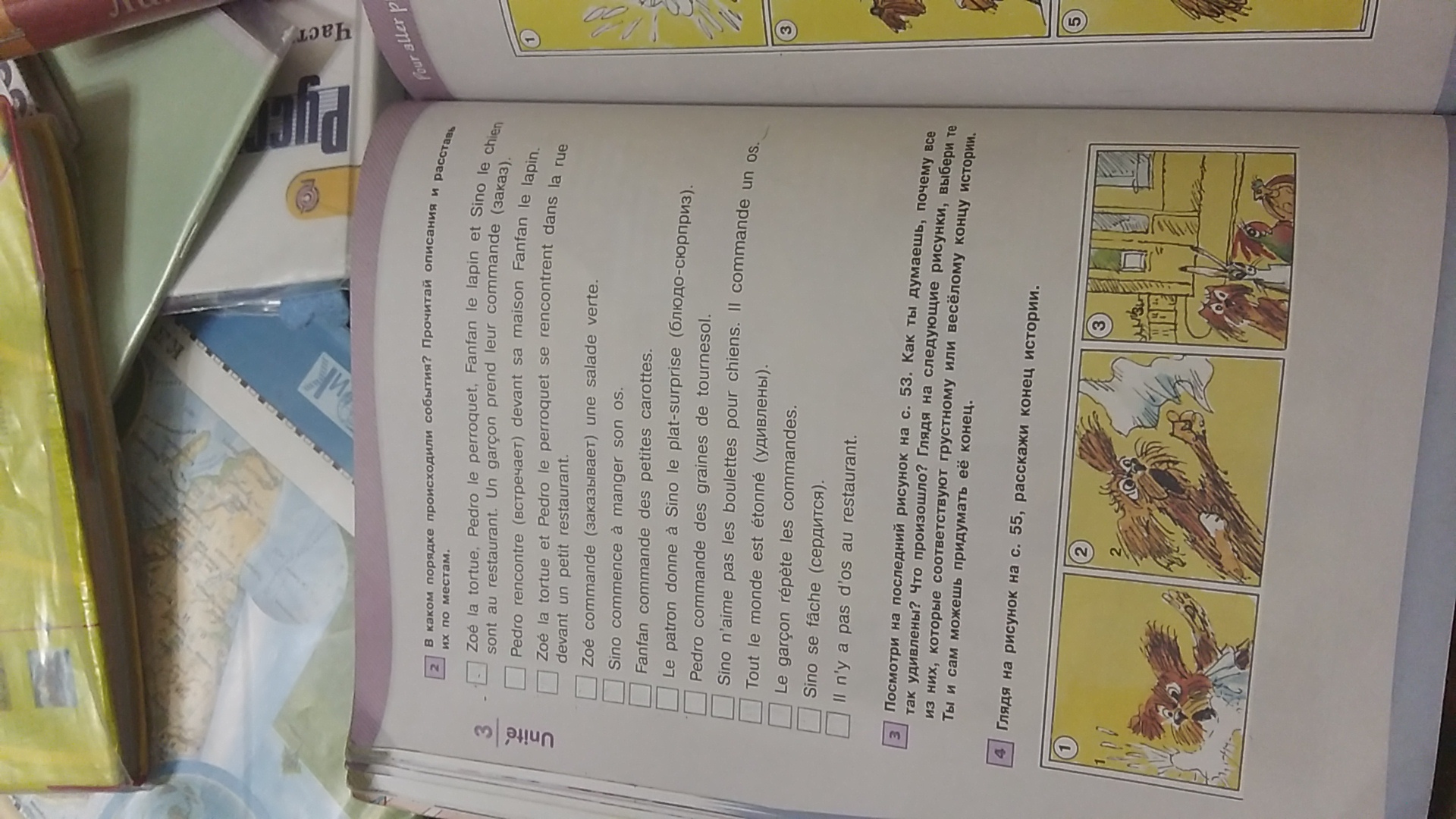 3 - 1)Черепаха Зоя, попугай Педро, кролик Фанфан и собака Сино в ресторане. Официант принимает их заказ.