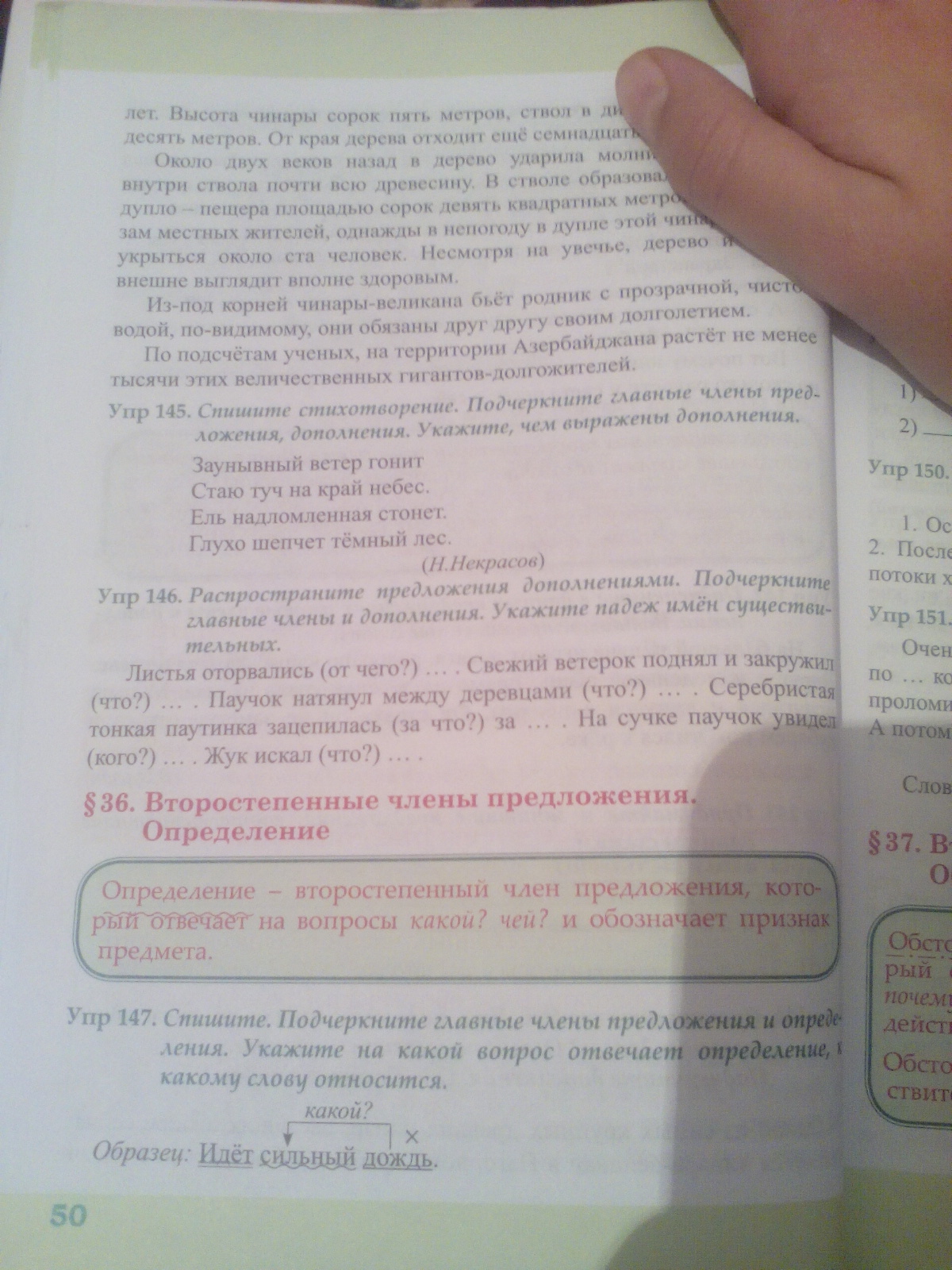 главные члены предложения: ветер гонит, ель стонет, шепчет лес. дополнения:заунывный, надломленная, тёмный, выражены прилагательными