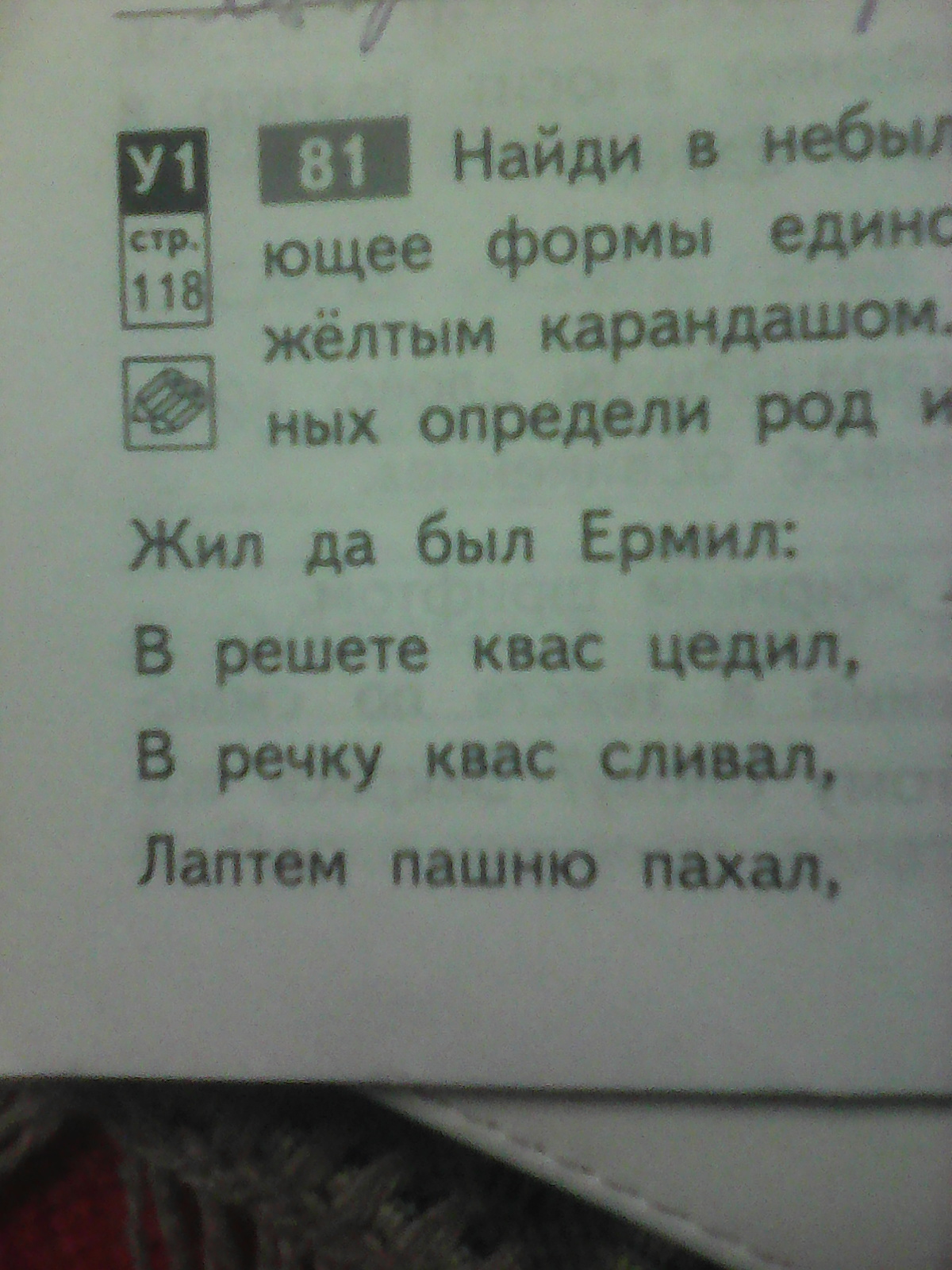 Найди в небылице существительное не имеющее формы единственного числа закрась его желтым карандашом всех других существительных определи род и напиши его над ними