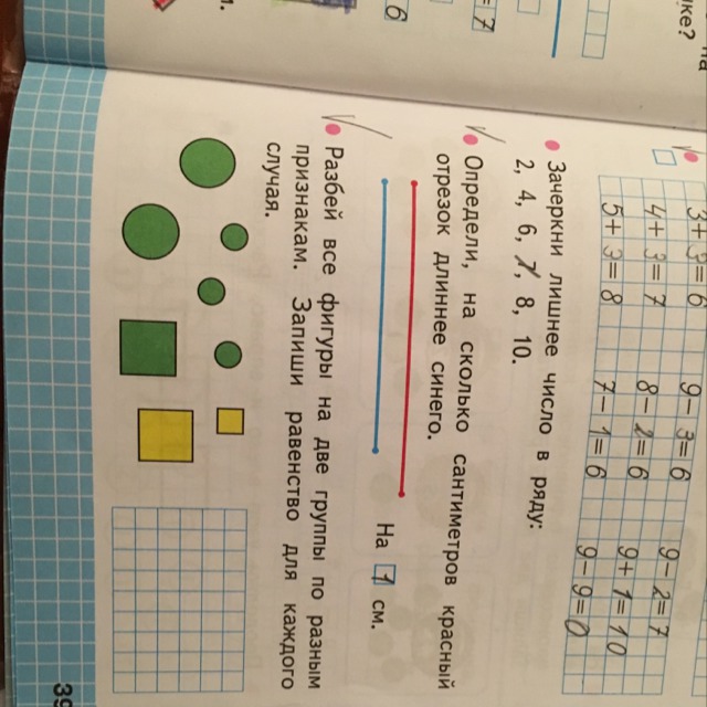Разбей все фигуры на две группы по разным признакам . Запиши равенство для каждого случая. Пожалуйста