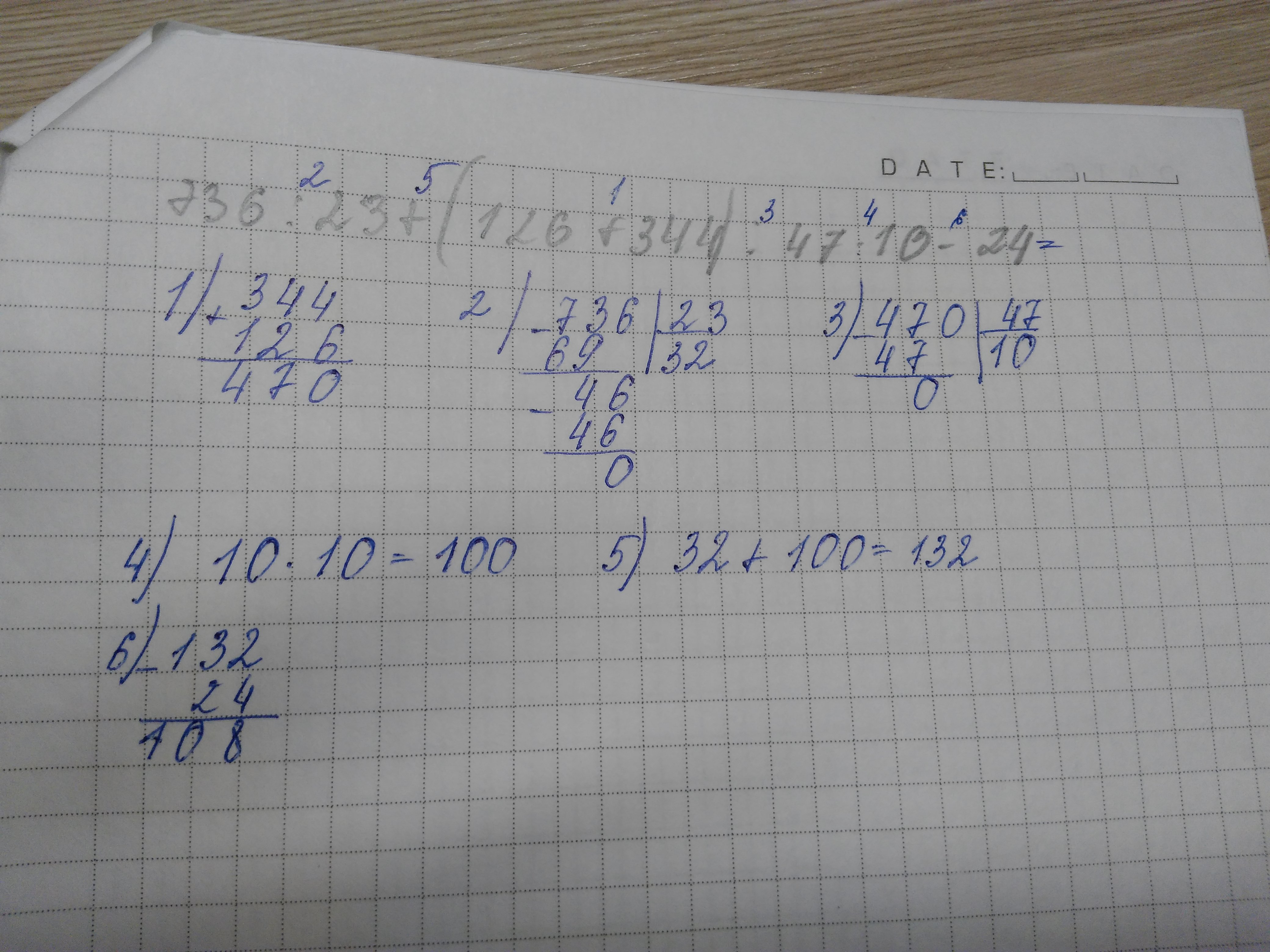 736 : 23 + ( 126 + 344) : 47 × 10 - 24 = 108