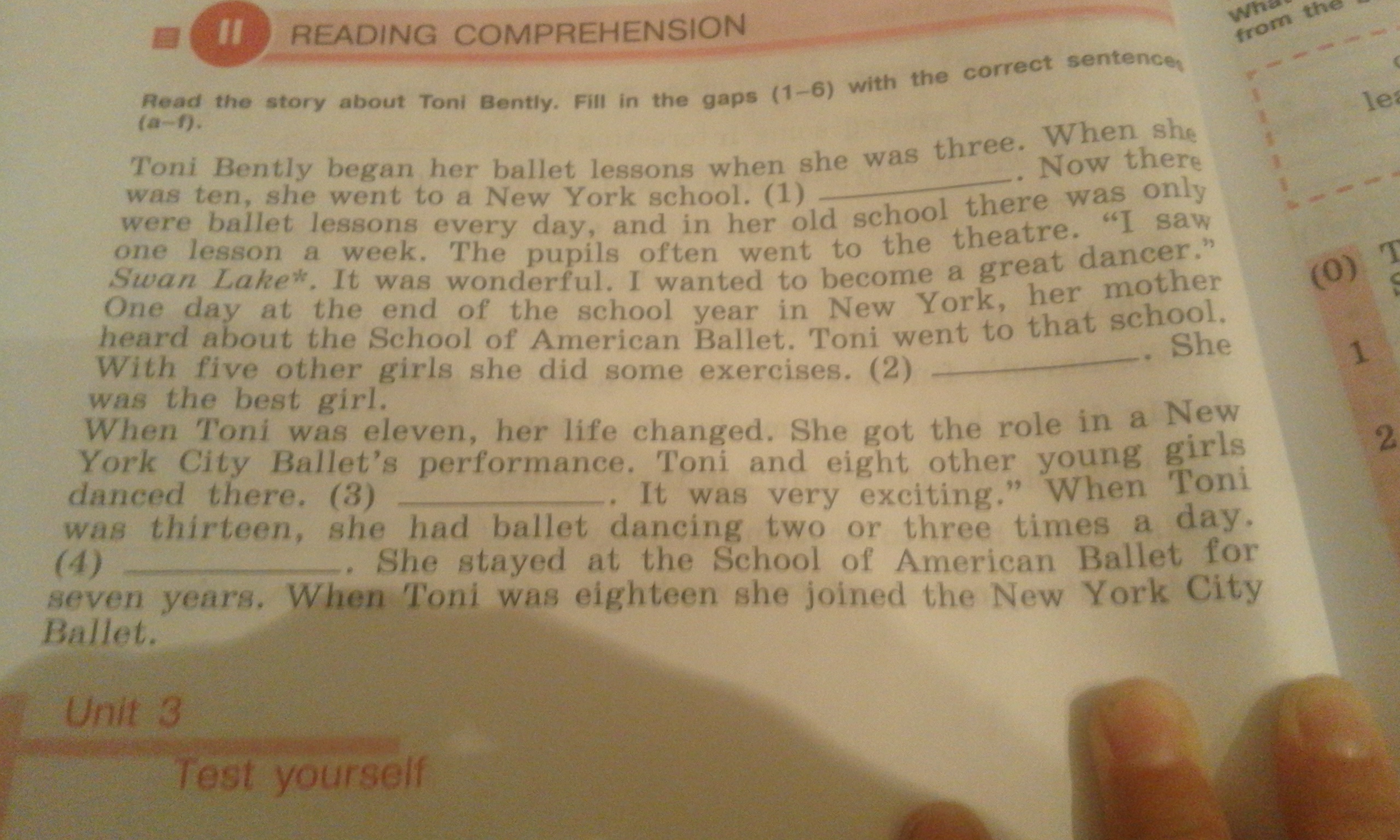 Тони Бентли начала свои занятия балетом, когда ей было три года.Когда ей исполнилось 10 лет, она пошла в Нью-Йоркскую школу балета.(1)___ Здесь сейчас уроки балета были каждый день, а вв ее прошлой школе они были раз в неделю, Ученики часто ходили в театр," Я видела (смотрела) "Лебединое озеро". Это было великолепно. Я хотела стать великой балериной (танцовщицей)". Однажды в конце учебного года в Нью-Йорке ее мама услышала о Школе Американского Балета.Тони пошла в эту школу. С пятью другими девочками она выполнила какие-то упражнения. Она была лучшей девочкой. Когда Тони исполнилось 11, ее жизнь изменилась. Она получила роль в представлении Нового городского Нью-Йоркского балета. Тони и еще восемь других девочек танцевали там.Это было волнующе.Когда Тони исполнилось 13 лет , она выходила танцевать по три раза в день. Она осталась в Школе Американского балета на 7 лет.Когда Тони исполнилось 17, она поступила в труппу Нью-Йоркского городского балета.