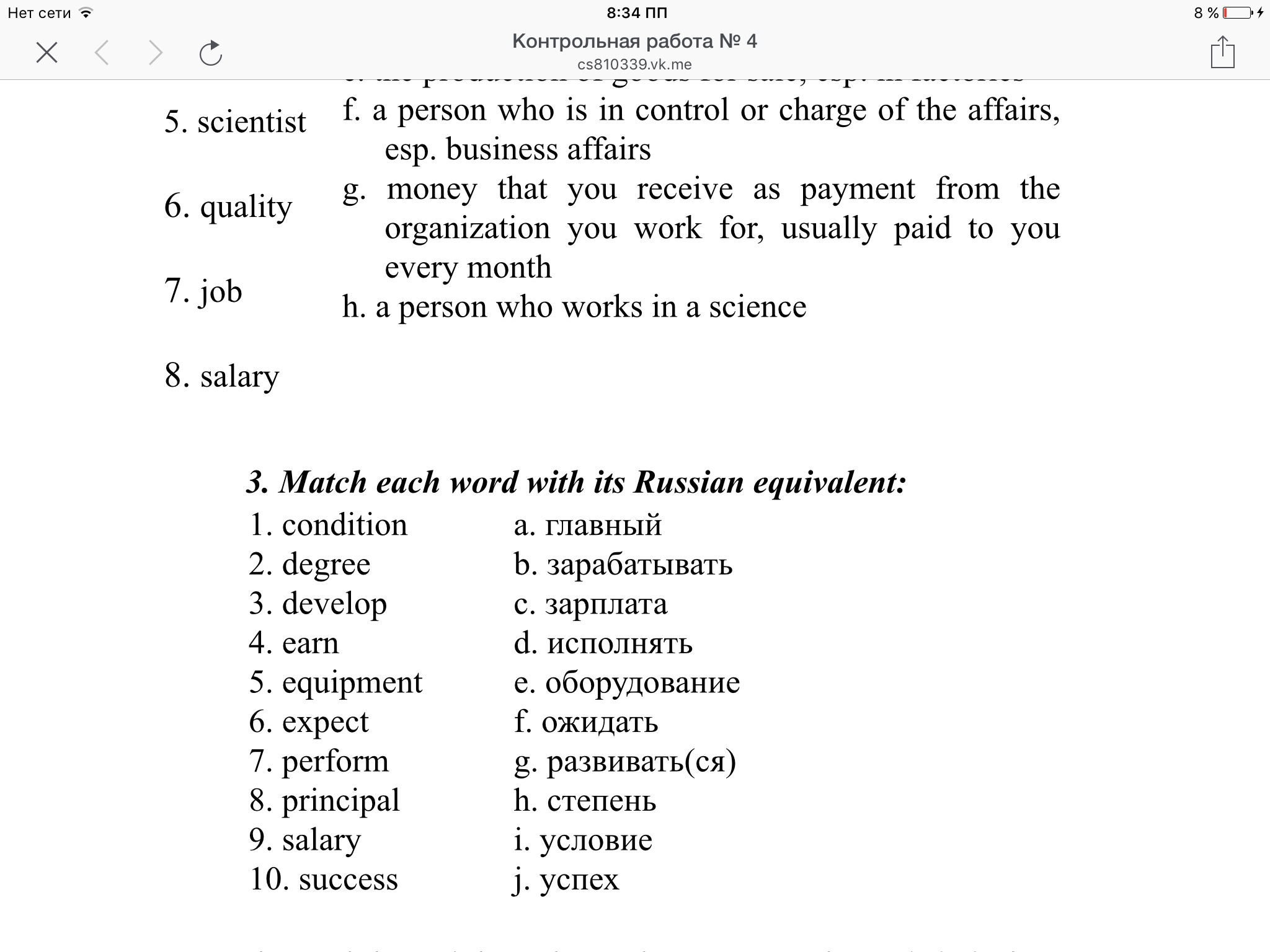 зарабатывать-earn, зарплата-salary, оборудование- equipment, ожидать-expect, развивать(ся)-develop, степень-degree, условие-condition, успех-success, главный-principal, исполнять-perform.