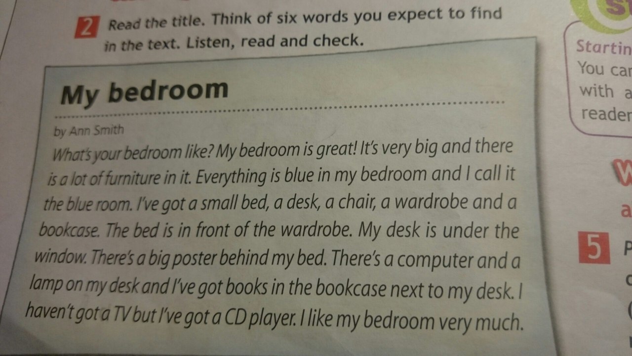 Как выглядит твоя комната? Моя комната великолепна. Она очень большая и в ней много мебели.Все в моей комноте синее и поэтому я называю её синяя комната. У меня маленькая кровать, стол, стул, гардероб и книжная полка. Кровать находиться напротив гардероба. Мой стол под окном. За моей кроватью весит огромный плакат. На моем столе есть компьютер и лампа, и несколько книжек в полке. У меня нету телевизора, за то есть сд плеер. Я люблю свою комноту очень сильно