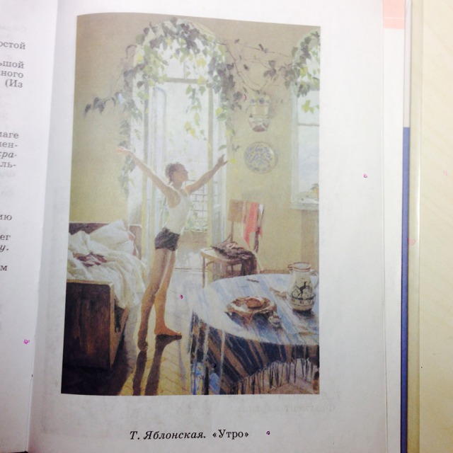 На картине Т. Яблонской "Утро" изображено яркое, летнее утро. Девочка лет 11 только встала и собирается делать зарядку. Она выглядит так, что сегодня у неё точно будет хороший и удачный день. Кажется, что вместе в ней радуются все вокруг. Рядом стоит незаправленная кровать, стол с голубо-белой скатертью и стул на котором лежит её форма. По середине комнаты расположена большая дверь, со входом на балкон или веранду. Свет из окон льёт и озаряет всю комнату. Сзади, по всей нежно-жёлтой стене и оконным рамам разрослось завивающееся растение из настенной вазы, придающие ощущение свежести . Ниже висит очень красивая декоративная тарелка, она хорошо вписывается в интерьер комнаты. Сама обстановка говорит, что пора вставать, жить новый день и радоваться. Глядя на картину можно приобрести ощущение бодрости, простора, свежести и свободы.