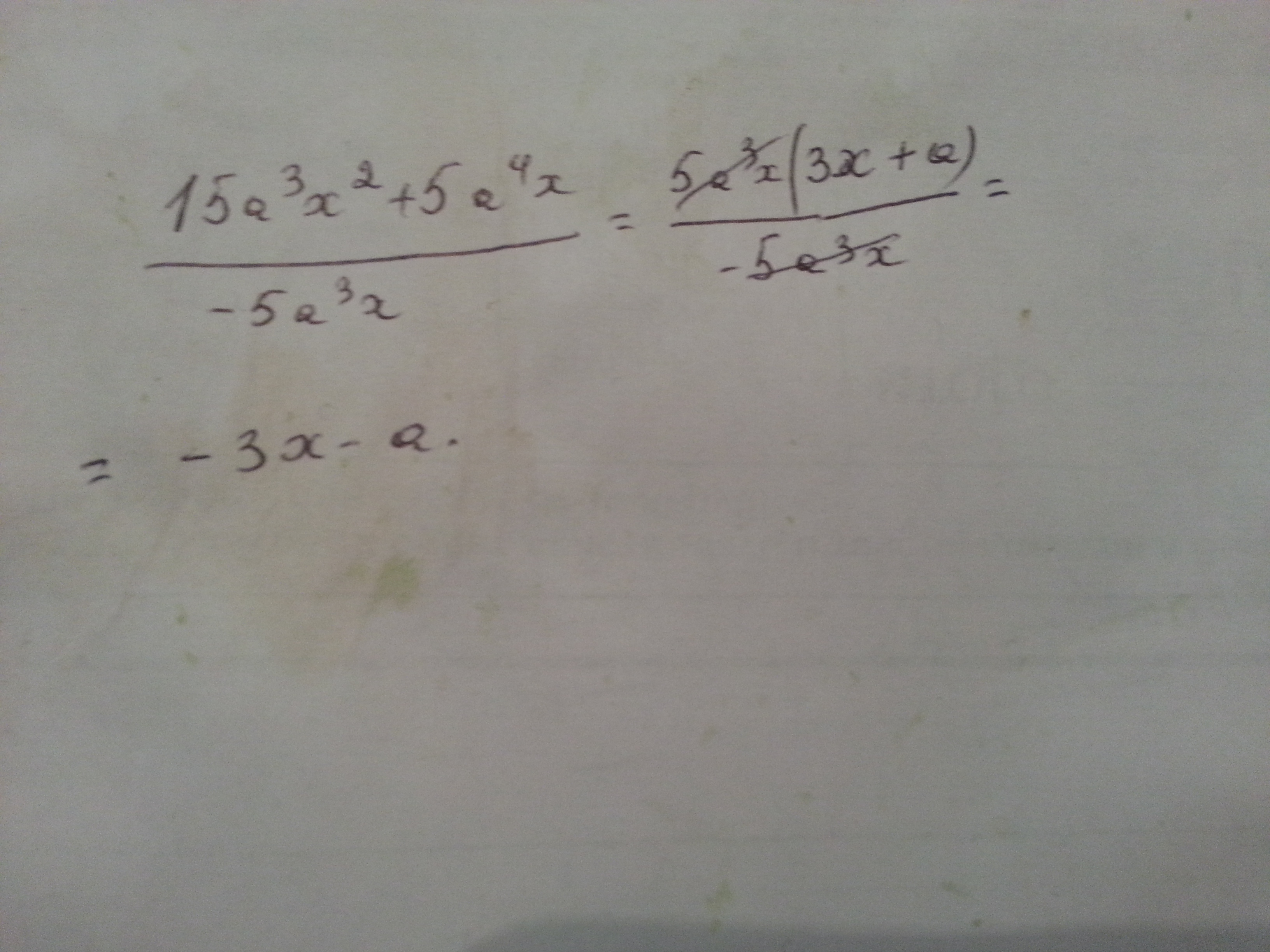 2) ( 5a^3x•( 3x + a )) : ( - 5a^3x ) = ( 3x + a ) : ( - 1 ) = - 3x - a