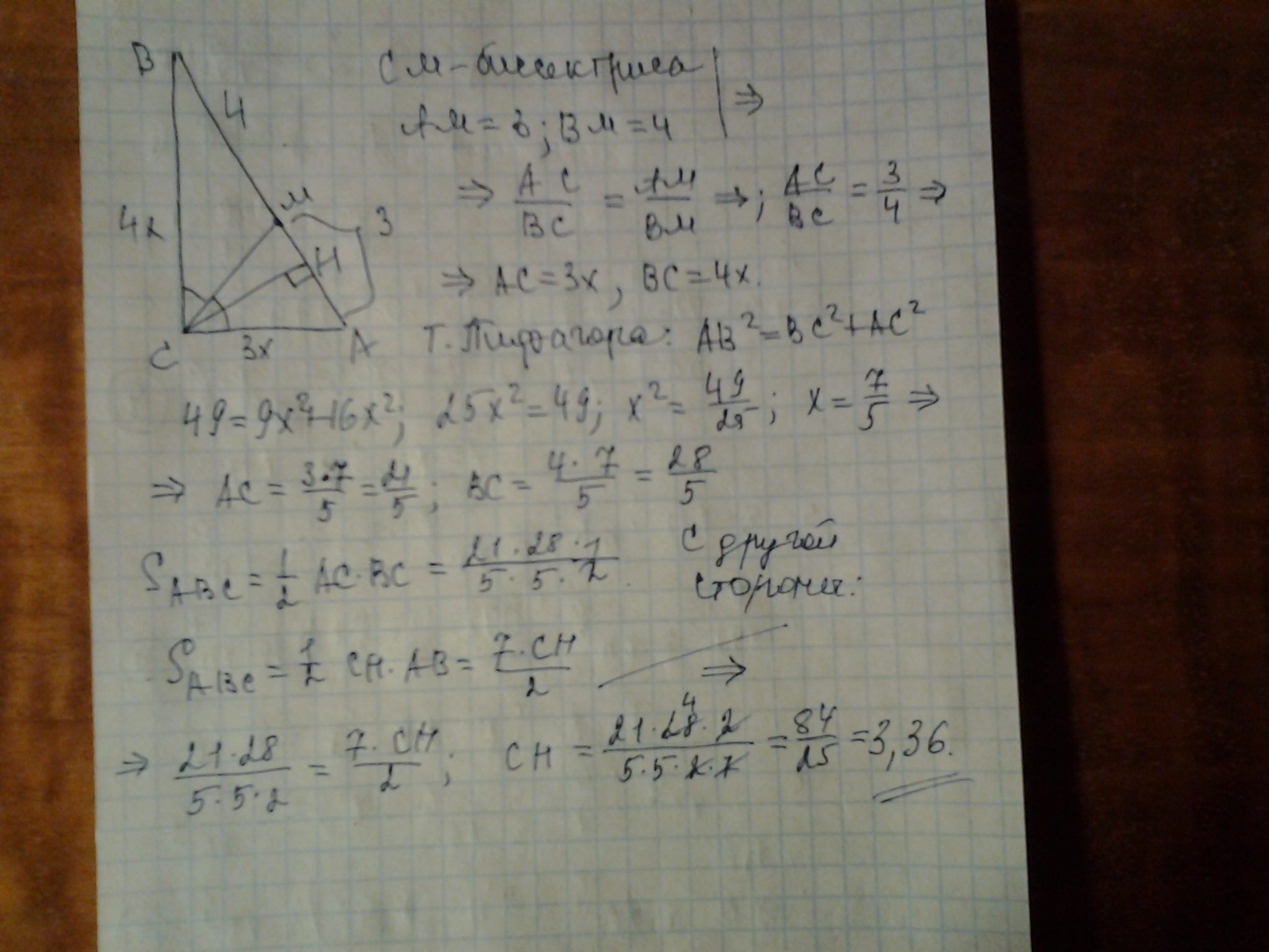 Бісектриса прямого кута прямокутного трикутника поділяє гіпотенузу на відрізки, що дорівнюють m і n. Визначте висоту, проведену з вершини прямого кута і обчисліть її значення, якщо m=3; n=4.