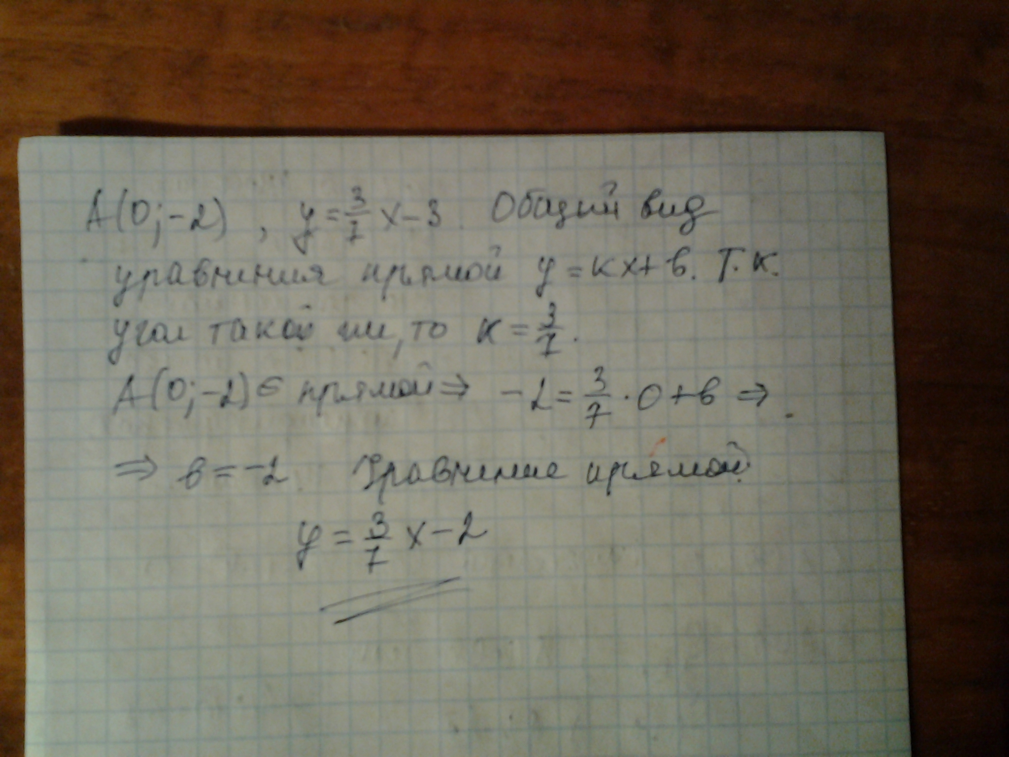 Cоставить уравнение прямой проходящую через точку (0;-2) и составляющей с положительным направлением оси ОХ такой же угол, что и прямая y=3/7x-3