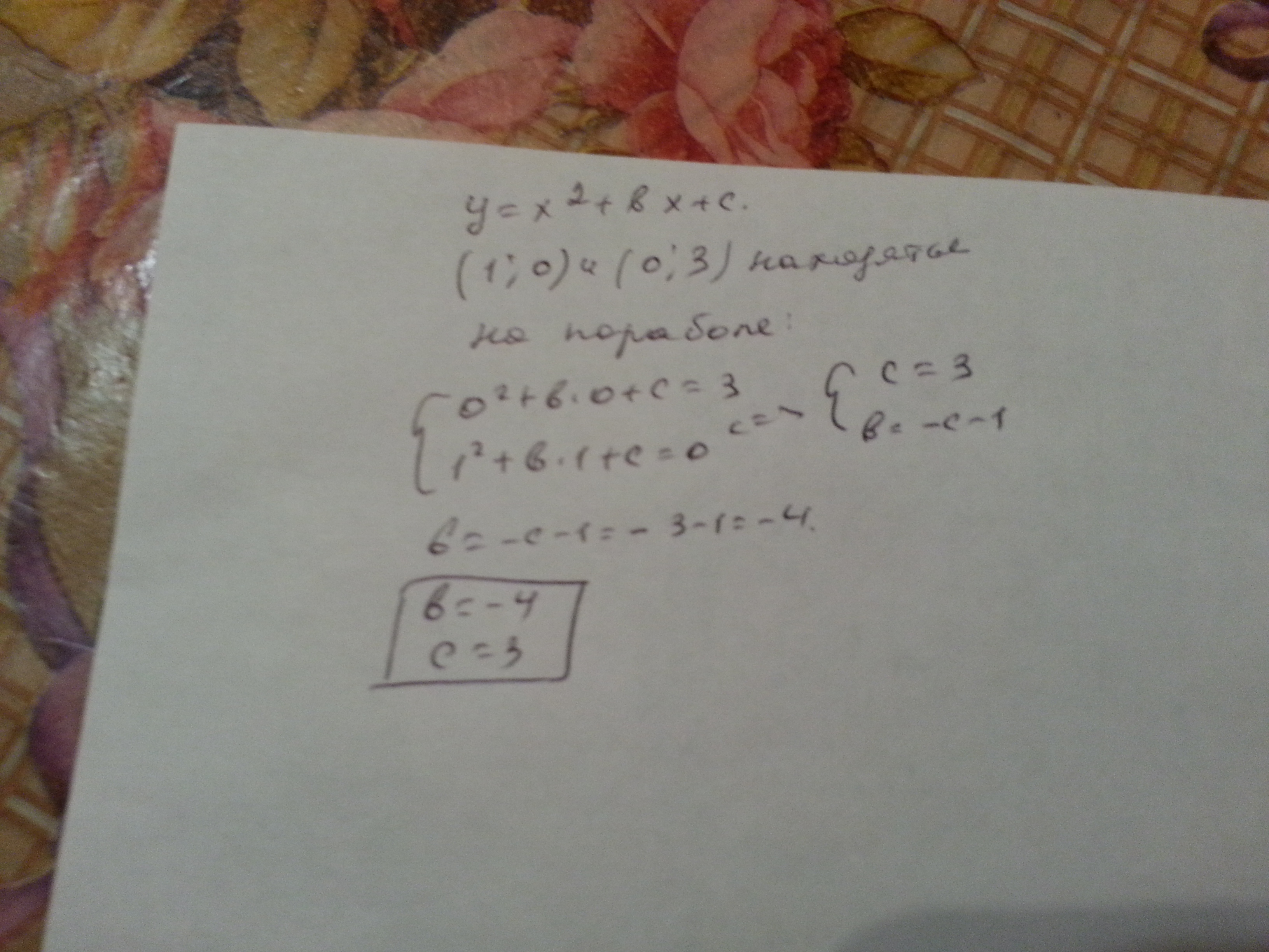 При каких значениях b и c парабола y=xквадрат+bx+с пересекает ось абцисс в точке( 1;0), а ось ординат в точке(0;3).