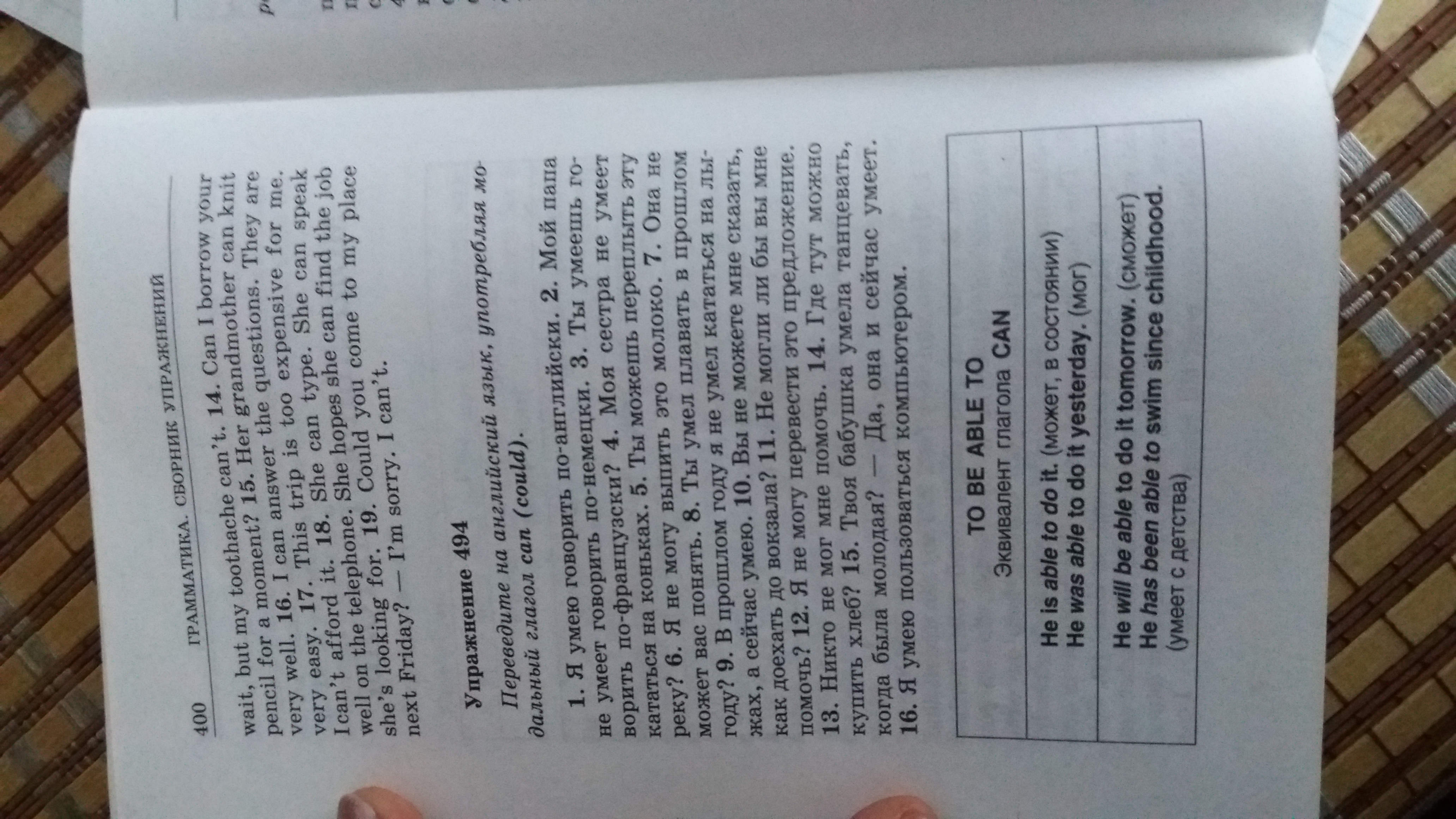 1. I can speak English. 2. My father can't speak German.3. Can you speak French?4. My sister can't skate.5. Can you swim across the river?6. I can`t drink this milk.7. She can`t understand you.8. Could you swim last year?9. I couldn't ski last year but now I can.10. Can you tell me how to get to the station?11. Can you help me?12. I can't translate this sentence.13. Nobody can help me.14. Where can I buy bread?15. Could your grandmother knew how to dance when she was young? Yes, she still can.16. I know how to use a computer.