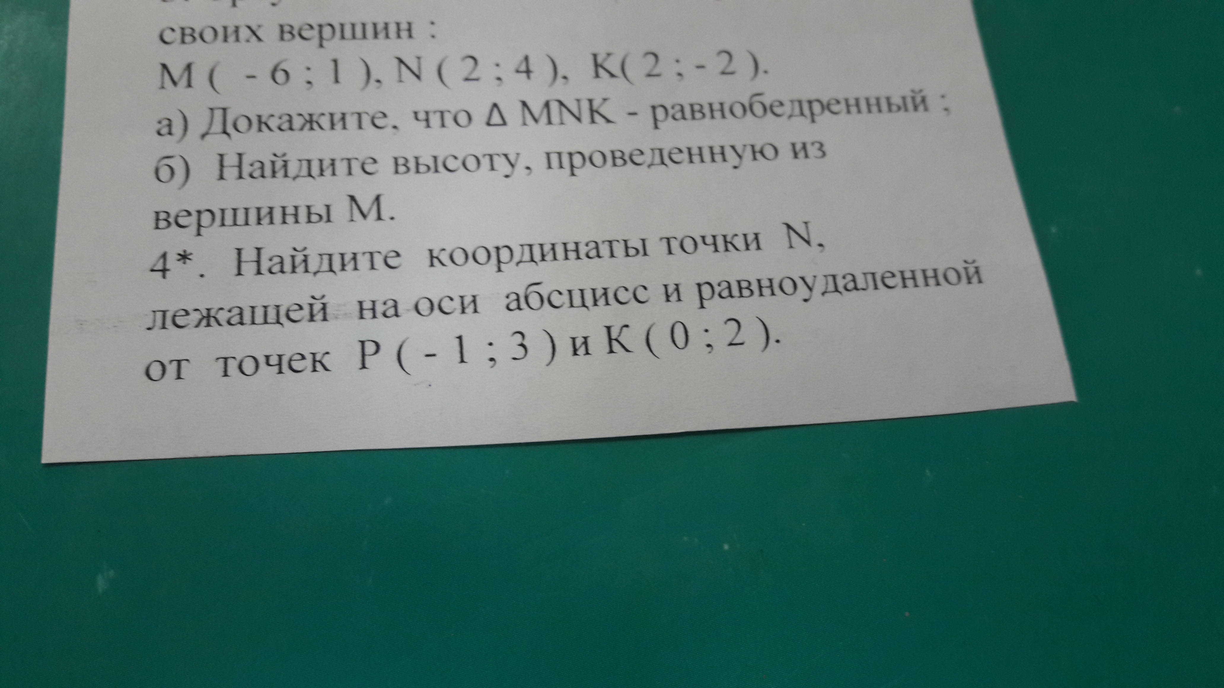 Н лежит на оси абцисс, значит у=0. Н равноудалена от точек Р и К, значит M(-0.5; 2.5) - cередина отрезка. Отнимем от значения х значение у, это и будет координатой по Х: