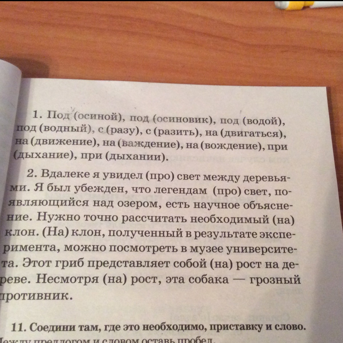 под осиной, подосиновик, под водой,подводный, сразу, сразить, надвигаться, на движение, наваждение, на вождение, придыхание, при дыхании.