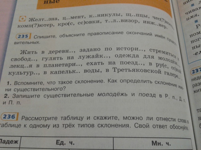 спишите объясните правописание окончаний имен существительных.запишите существительные молодежь и поезд в Р. п., Д. п. и П