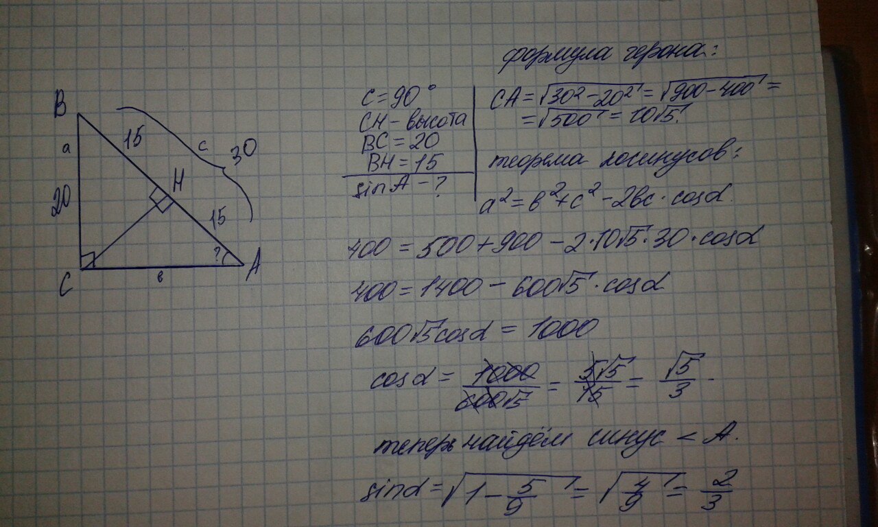 1.В треугольнике АВС угол С=90,СН-ВЫСОТА,ВС=20,ВН=15.Найдите sinA.
