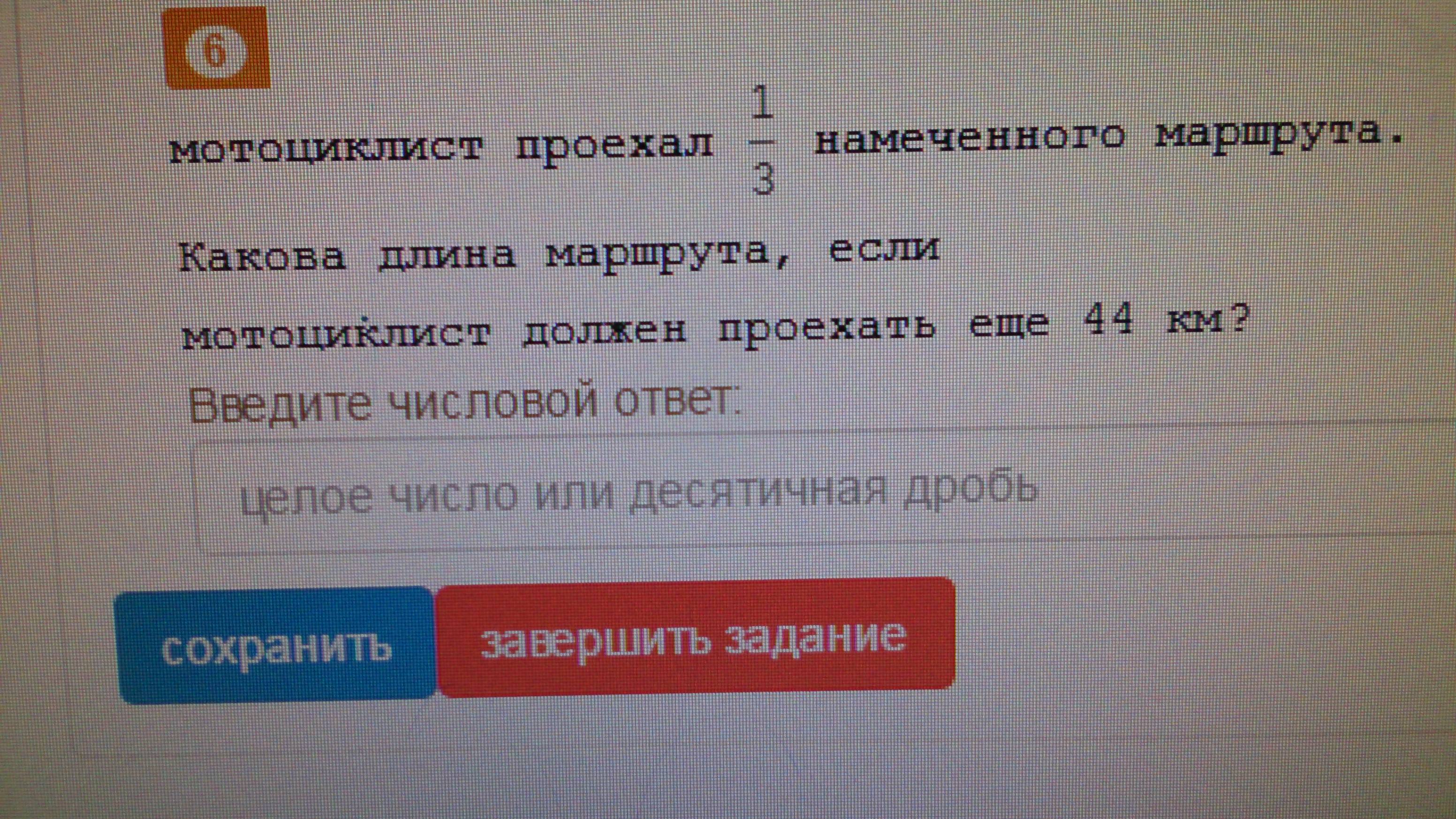 Если мотоциклист проехал 1/3 пути, значит осталось проехать ещё 2/3 пути. По условию ему осталось проехать 44 км, значит: