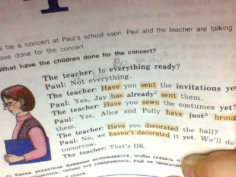 Учитель: все готово? Пол: еще нет. У: приглашения уже разослали? П: да, Джей их уже разослал. У: а костюмы уже сшили? П: да, Алиса и Полли только что их принесли. У: зал украсили? П: нет, еще не украсили. Мы сделаем это завтра. У: хорошо.
