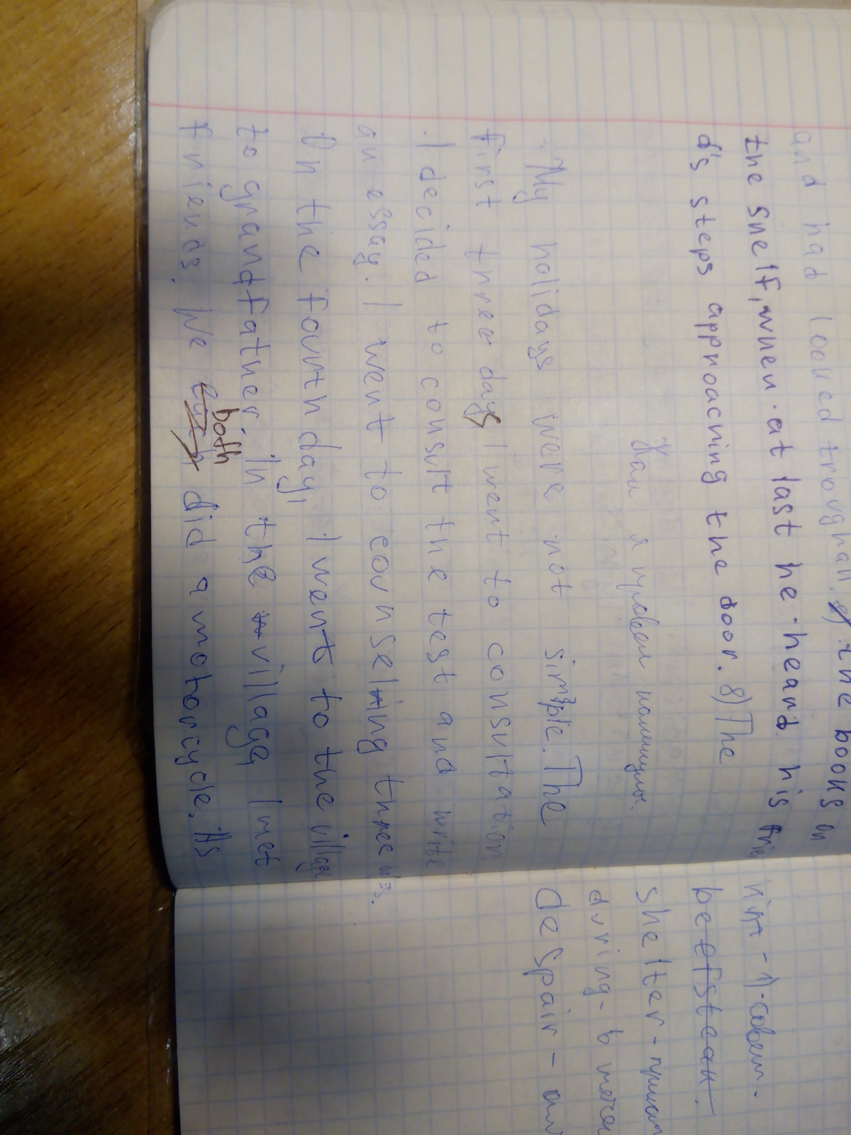 Ай дэсайдид ту консалт зэ тэст энд райт эн эссэй. Ай уэнт ту (непонятное слово) сри дэйз. Он зэ фос дэй ай уэнт ту зэ виладж ту грэндфазэ. Ин зэ виладж ай мэт фрэндз. Уи боз дид э мотосайкл.
