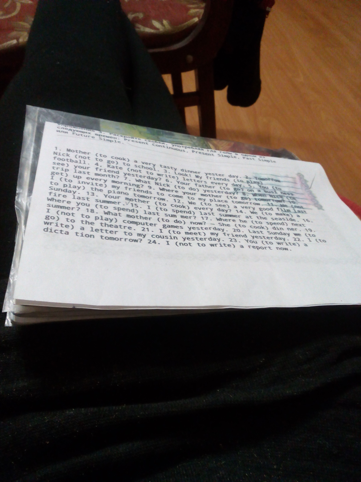 пишу только то, что нужно изменить, остальное так же в предложение остается 1. cooked 2. will go 3. is playing 4. doesn't write 5. did you see 6. did your father go 7. what did Nick do yesterday? 8. When does Nick get up 9. where is your mother going tomorrow? 10. здесь может быть invited (если имеется в виду, что до этого пригласили, но завтра придут друзья) и will invite (если имеет в виду, что завтра собираются пригласить друзей).11. he will not play 12. saw 13. does your mother cook 14. made 15. spent 16. where did you spend 17. where will he spend 18. what is mother doing now; is cooking 19. I didn't play 20. we went 21. I met 22. I wrote 23. will you write 24. I am not writing