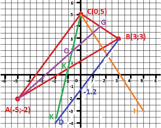 Кх =(3+ -5)/2 = -1, Ку = (3+ -2)/2 = 0,5, Точка К(-1;-0,5).