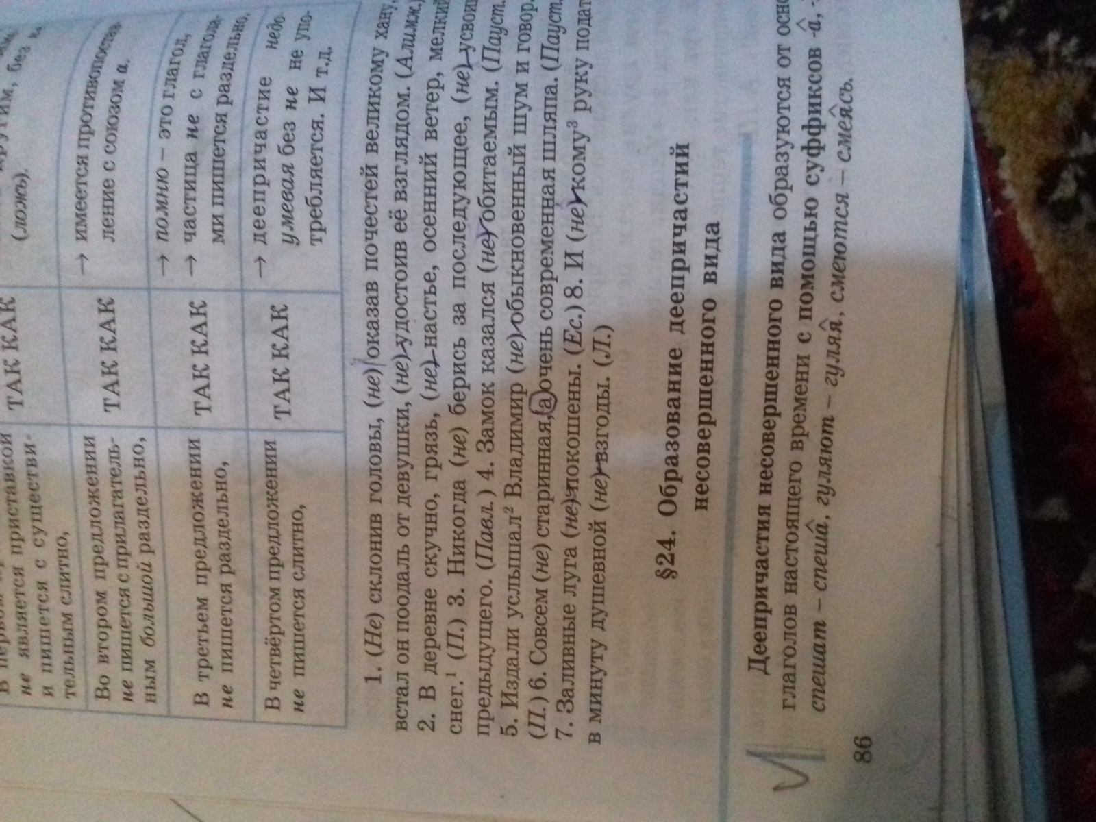 Не склонив (краткое причастие), не оказав (краткое причастие), не удостоив (краткое причастие), ненастье (без не- не употребляется), не берись (не- с глаголом пишется раздельно), не усвоив (краткое причастие), необитаемым (прилагательное), необыкновенный (прилагательное), не старинная (есть союз а), не покошены (краткое причастие), некому (ударение падает на не-), невзгоды (без не- не употребляется).