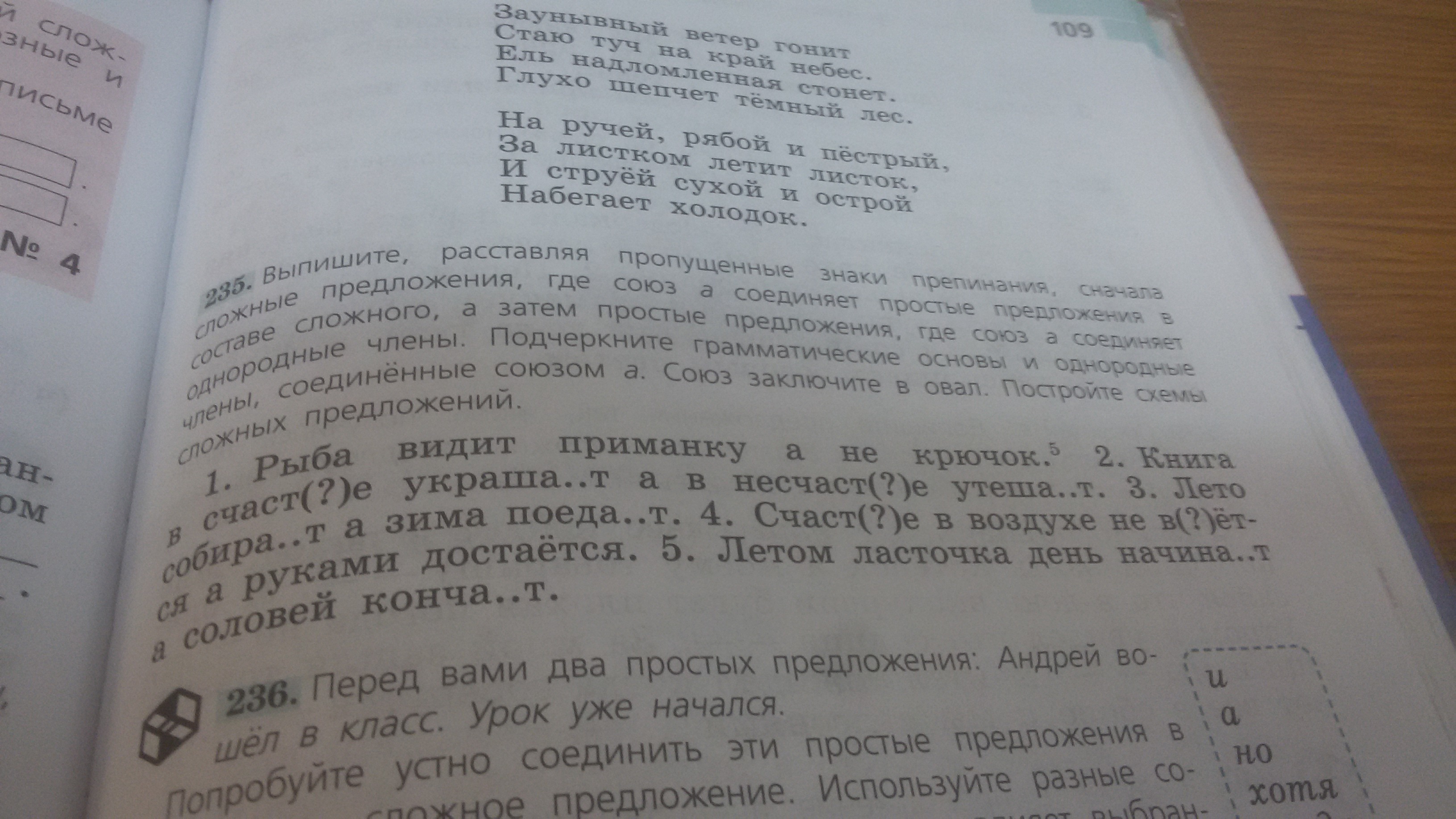 1. Рыба видит приманку, (а) не крючок. 2. Книга в счастье украшает, (а) в несчастье утешает. 4. Счастье в воздухе не вьется, (а) руками достается.