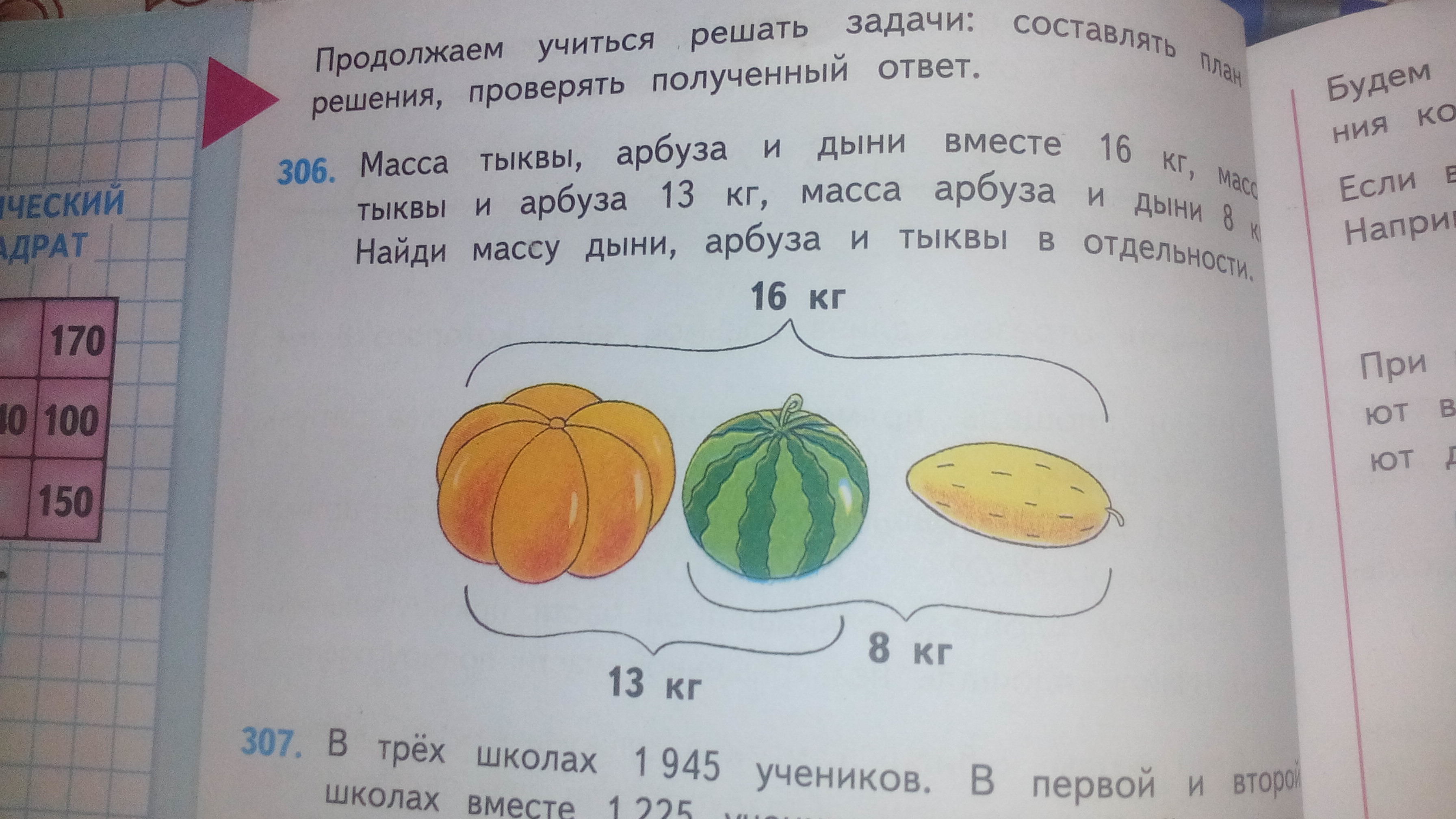 x - тыква, y - арбуз, z - дыня, имеем систему: y+z=8; y+x+z=16; x+y=13; т.к x+y=13, то 13+z=16, z=16-13=3; а т.к y+z=8, то 8+x=16; x=8; y=8-z=8-3=5; Ответ: арбуз: 5, дыня: 3, тыква: 8