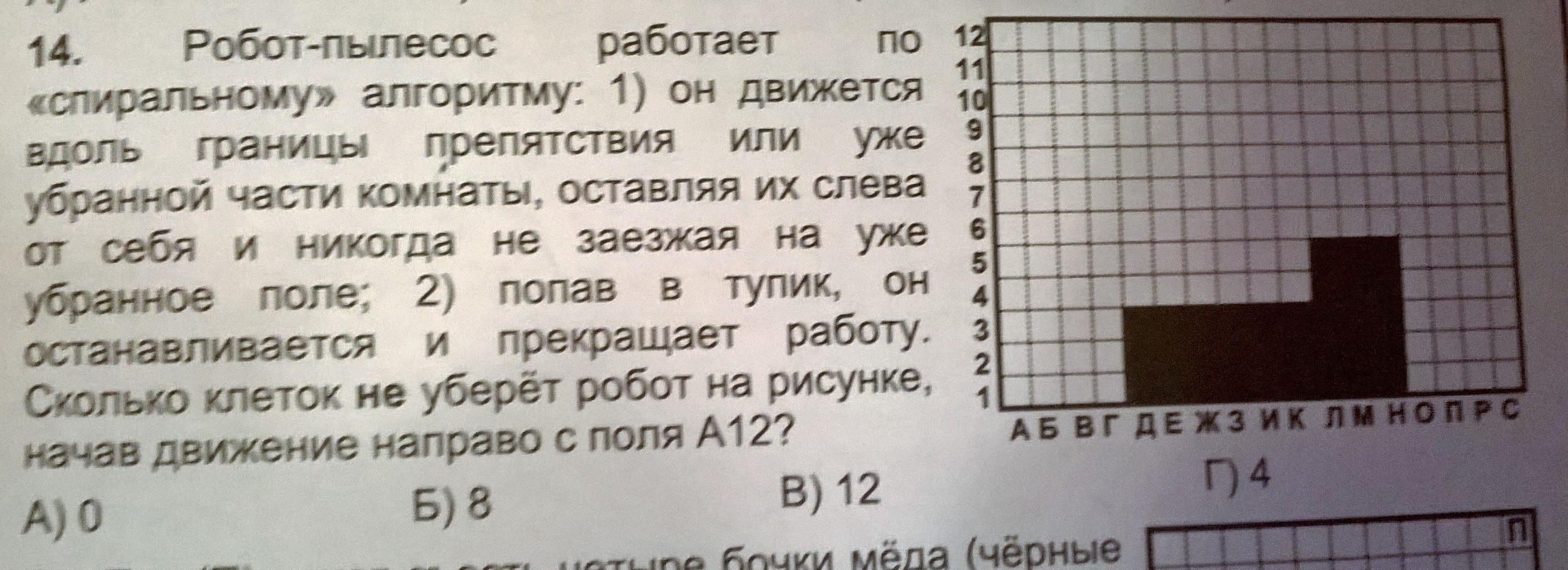 Если комната будет полностью грязной, то он не оставит ни одной грязной клетки, а если комната будет засорена так, как на картинке, то он так же ничего не оставит.