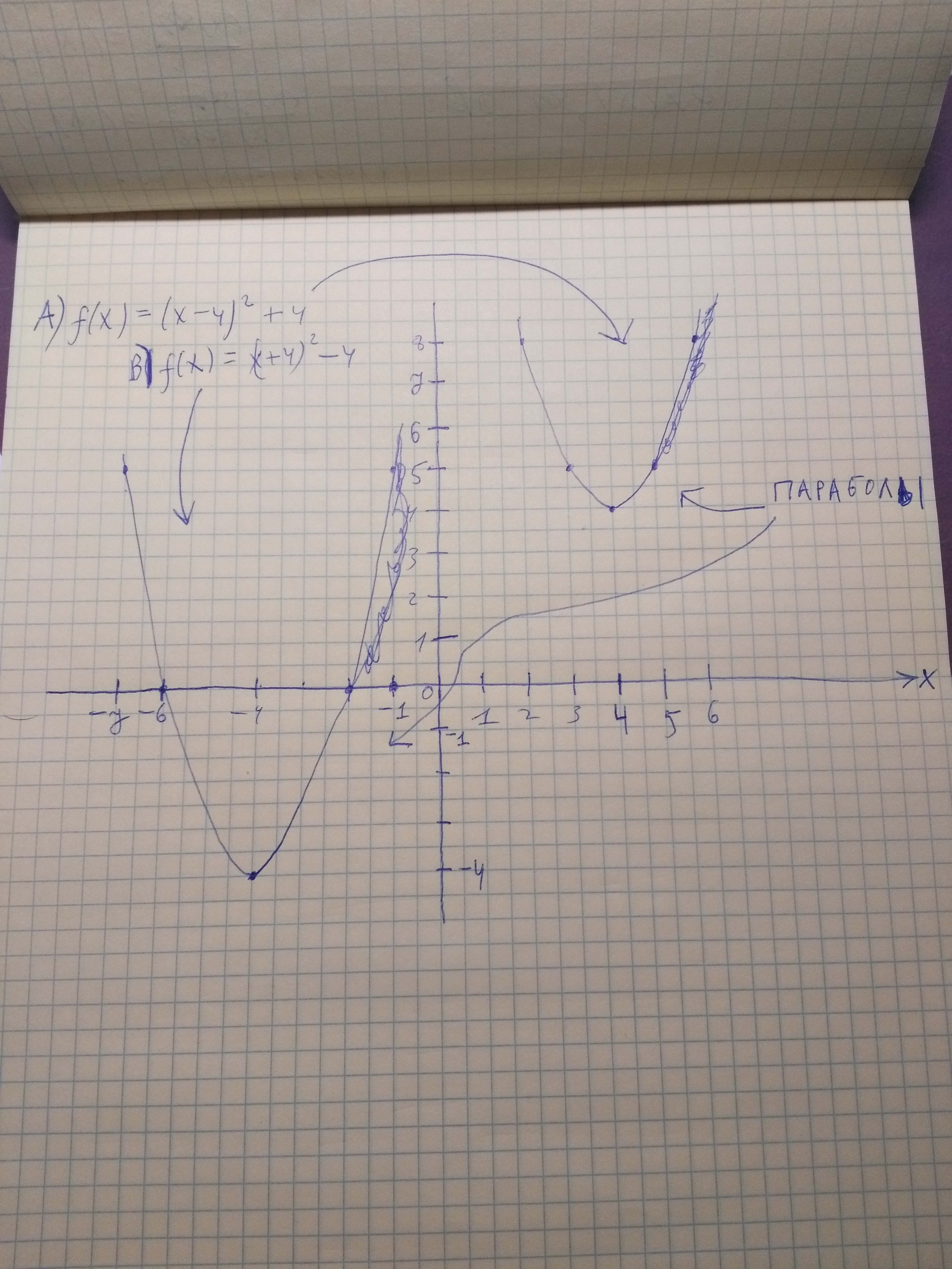 Это две параболы. Первая смещена по Х на 4 и поднята по У на 4. Вторая смещена по Х на -4 и опущена по У на -4. На фото графики.